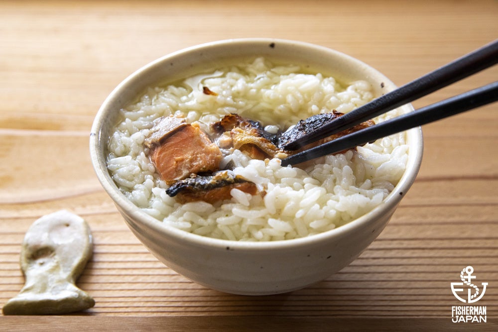 塩を多めにひいた銀鮭を焼いて、米の上に乗せて、水をかけるだけ。