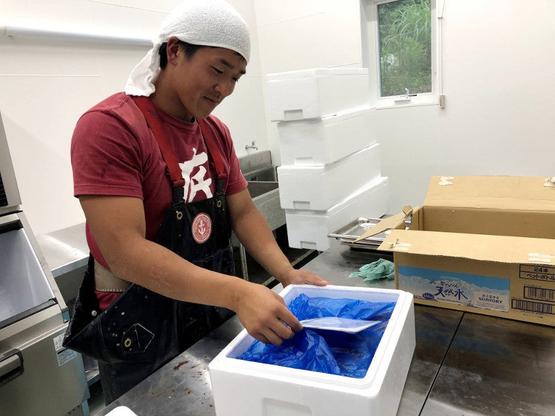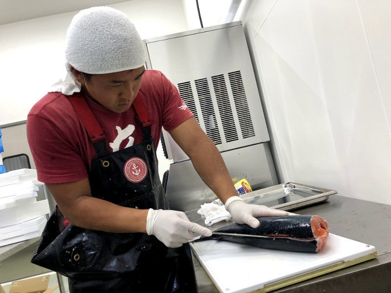 「なんか緊張しますね笑」と言いながら、みなさんにお届けする銀鮭を1匹1匹丁寧に捌く三浦くん。