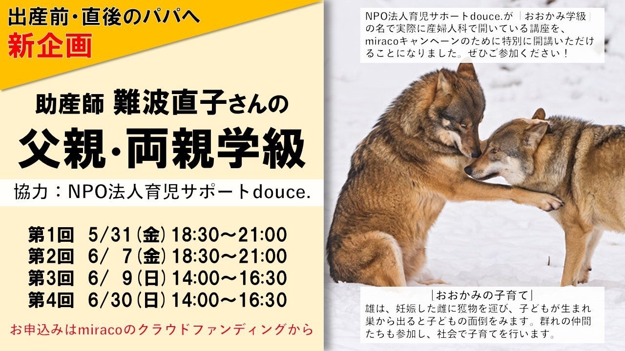 そんな中、miracoの考えに共感してくださった助産師、難波直子さん(NPO法人育児サポートdouce.代表理事)からご提案があり、普段「おおかみ学級」の名で産婦人科にて行っている両親学級を、miracoキャンペーンのために特別に開講してくださることになりました!