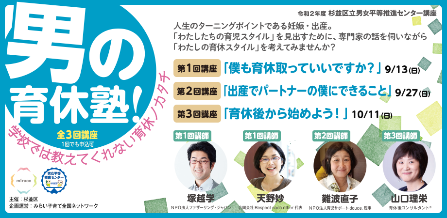《男の育休塾、開講します》miracoが企画運営する杉並区の講座、受付を開始いたしました!人生のターニングポイントである妊娠・出産。「わたしたちの育児スタイル」を見出すために、専門家の話を伺いながら「わたしの育休スタイル」を考えてみませんか?子育てと仕事の両立に対する不安やモヤモヤとした気持ちをシェアすることで、育休取得について参加者同士で考えたり、繋がることができる講座です。これから出産を迎える方、育休の取得を考えている方、お申込みをお待ちしております。お知り合いにもご紹介ください。(主催:杉並区 企画運営:みらい子育て全国ネットワーク(miraco))▼申込や詳細はこちら(各回、先着25名)https://ikukyujuku.peatix.com/ <第1回>「僕も育休取っていいですか?」3回育休を取得し公認会計士や「イクボスプロジェクト」のコアメンバーなどと多方面で活躍している塚越氏と、3児の母であり日本企業の働き方改革のトリガーとして活躍する天野氏が、父親の仕事と育児の両立について社会の動きや仕組み、また企業における取組みを紹介します。<第2回>「出産でパートナーの僕にできること」NPO法人育児サポートdouce.理事である難波氏にご登壇いただき、病院の母親学級では教えてくれない出産のプロセスを助産師が教え、パートナーに何ができるかを教えます。また、育休取得経験者と共にパートナーができることをシェアします。<第3回>「育休後から始めよう!」育休後コンサルタントの山口氏にご登壇いただき、男性も育休後にマミートラックにはまるのか?復職後に自分の席があるのか?女性以上に男性にも復職不安があります。育休後コンサルタントがワークショップを通じて育休後の不安を払しょくしていきます。【開催日時】①9月13日(日)10:00~12:00終了予定(9:30受付)②9月27日(日)10:00~12:00終了予定(9:30受付)③10月11日(日)10:00~12:00終了予定(9:30受付)【開催場所】※会場が回によって異なります。①高井戸地域区民センター(高井戸東3-7-5)②浜田山会館(浜田山1-36-3)③高井戸地域区民センター(高井戸東3-7-5)【アクセス】①③高井戸地域区民センター: 京王井の頭線「高井戸」駅下車 徒歩3分②浜田山会館: 京王井の頭線「浜田山駅」徒歩5分【参加費】 無料※チケットは大人の参加人数分お申し込みください。 〈例〉ご夫婦で参加の場合...チケット2枚【託児】詳細は申込みサイトをご覧ください。コロナ禍での講座につき、ソーシャルディスタンスを保つ形で、90名収容の部屋で人数を毎回先着25名までに絞り、感染予防に細心の注意を払って開催いたします。手指の消毒、非接触体温計測などを行います。マスク着用での参加、ご協力よろしくお願いいたします。