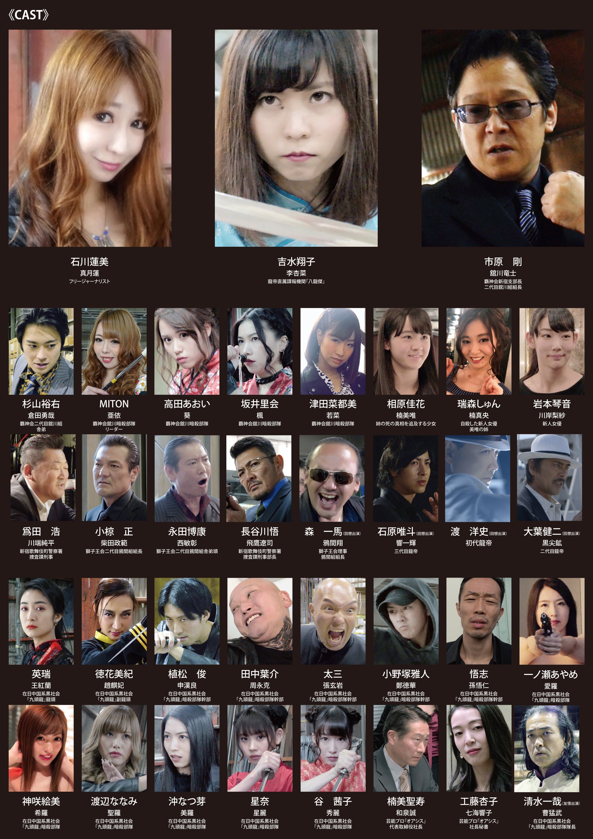 主演は引き続き、前作で鮮烈な女優デビューを飾った石川蓮美。今作でも、その見事なプロポーションから繰り出される吹き替えなしの体当たりのアクションを披露。そして、吉水翔子、市原剛、杉山裕右、MITON、長谷川悟ら龍帝組レギュラー陣がその脇を固め、さらに『ビー・バップ・ハイスクール高校与太郎狂騒曲』にて主人公ヒロシ&トオルを追い詰めた城東退学組・柴田&西こと、小椋正と永田博康が同シリーズ完結篇以来、30年ぶりにコンビ復活を果たすなど、バイオレンスな作品世界観を彩っている。
