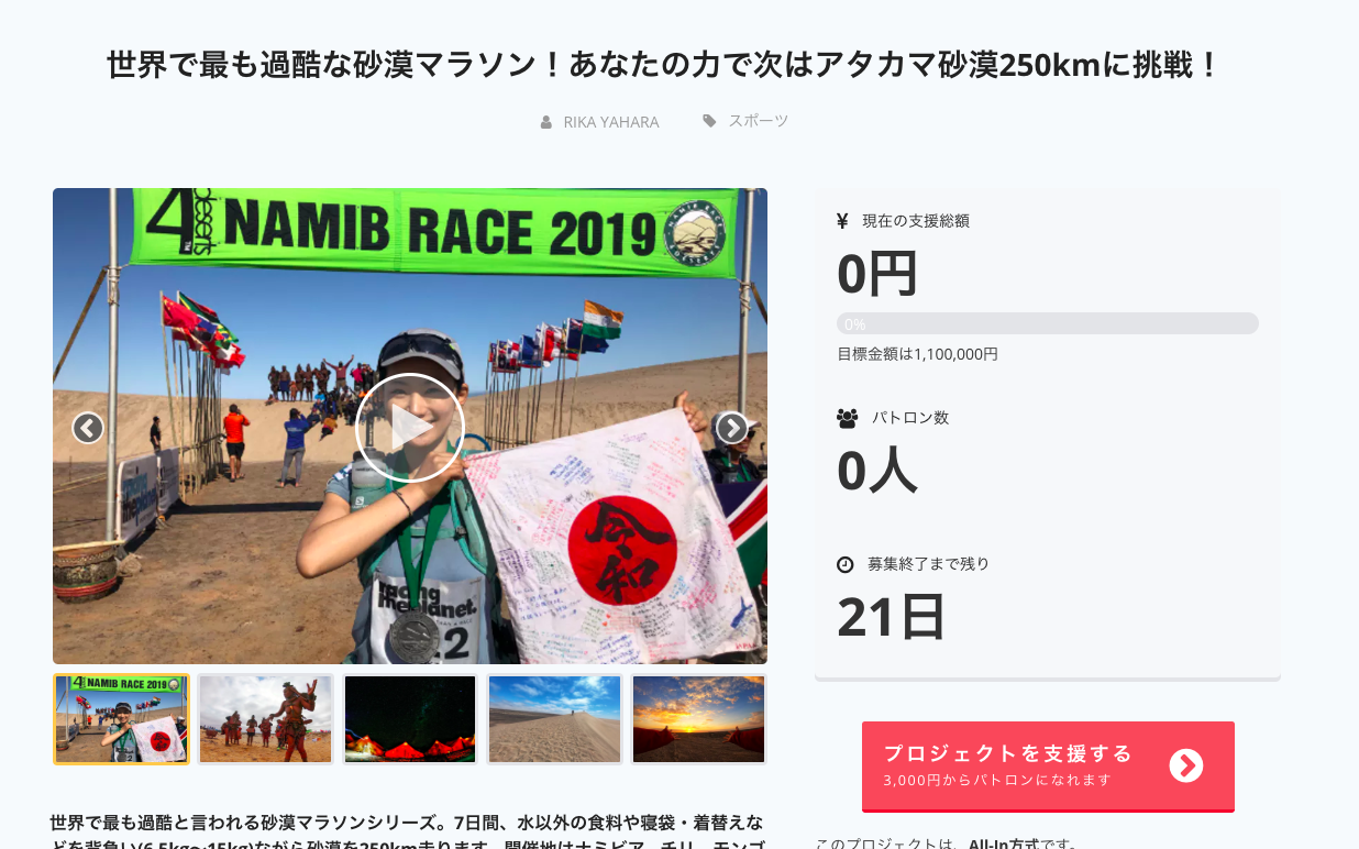 2019/09/02 19:27みなさま、こんばんは!いかがお過ごしでしょうか?前回のヤハラサハラ2_ナミブ砂漠編では、たくさんの方に支えられ、無事にナミブ砂漠250kmを完走することができました。私自身にとって初めてのクラウドファンディングでもありましたので、どうなるかドキドキしていましたが、たくさんのご声援をいただき、それが力となりました。心から感謝しています。さて、そのナミブ砂漠250kmからたったの5ヶ月しか経っていませんが、タイトルの通り、アタカマ砂漠250kmマラソンに挑戦します!!しかも今月です(2019年9月29日レーススタート)。シリーズ史上、「最も過酷で最も美しい」と言われていて、標高が3000mの砂漠が待っています。ルールは同じ、7日間自給自足。今回は時間もないし本当に個人的な挑戦になりますが「応援したいよ!」と行ってくれる暖かいお友達の一声でまたクラウドファンディングを実施させて頂くことにしました。世界で最も過酷な砂漠マラソン!あなたの力で次はアタカマ砂漠250kmに挑戦!前回のリターンで好評だったヤハラサハラオリジナルステッカー(考案中)はじめ、「おかえりなさい会参加券(数量限定)」や「砂漠であなたの名前を叫ぶ」などの面白リターンも用意しました。どうかまた皆さまのお力添えを何卒よろしくお願いします。 もっと見るリターン発送完了(ポストカード以外)のお知らせ