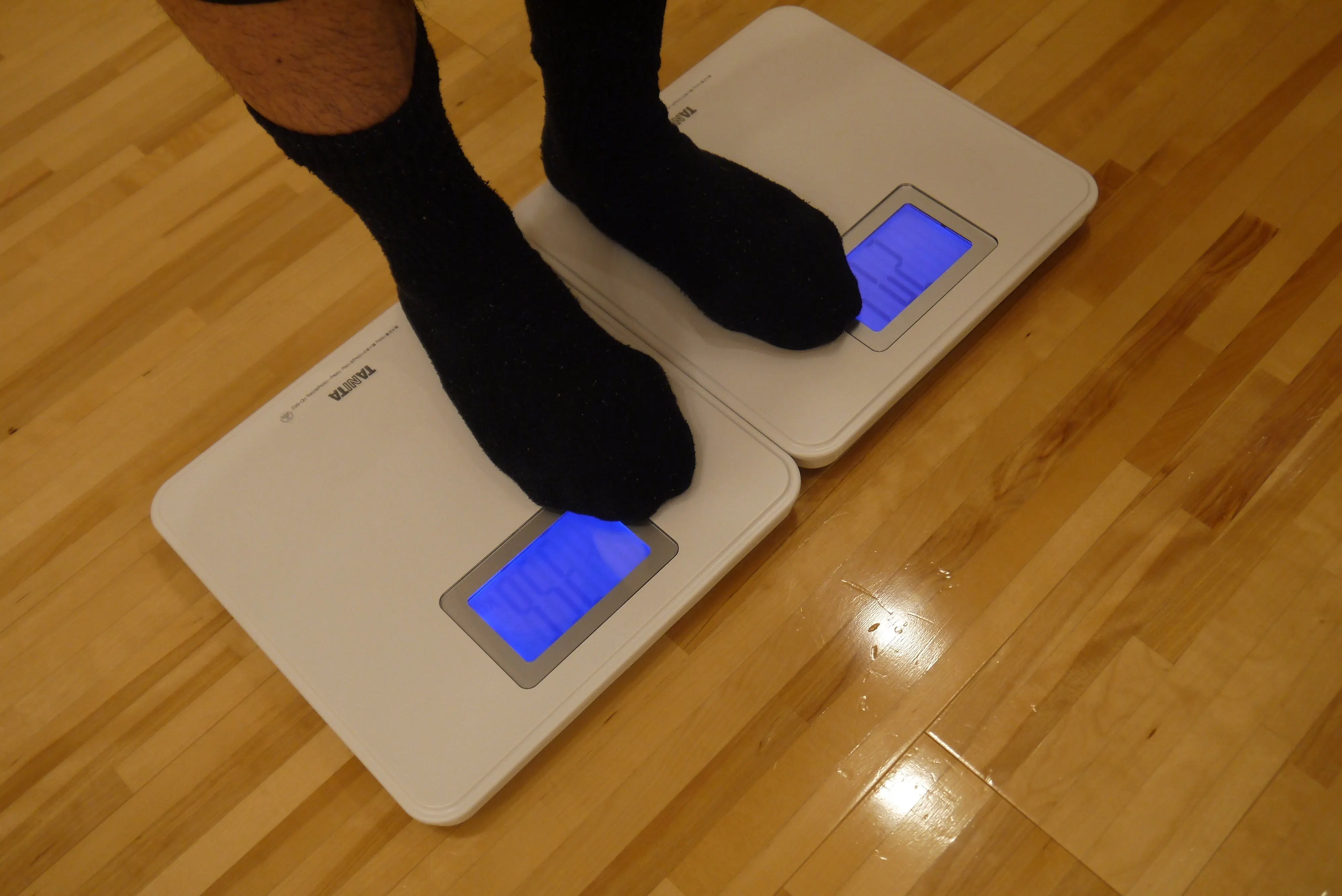 二つの体重計に立位で片脚ずつ同時に乗り、前方を見る。