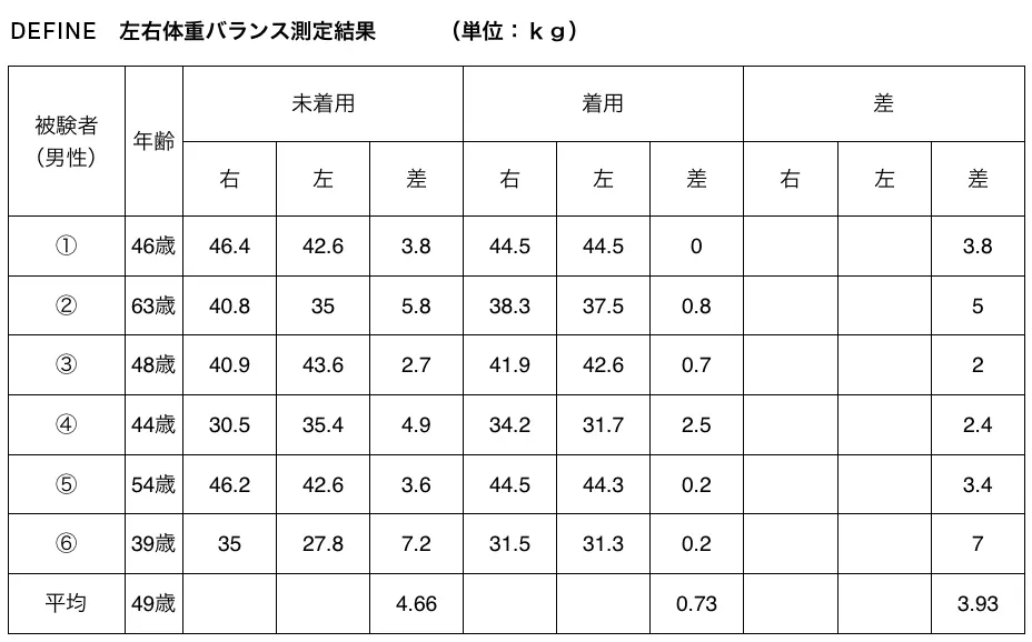 未着用で平均4.6㎏の左右体重差が着用で平均0.73㎏に改善。