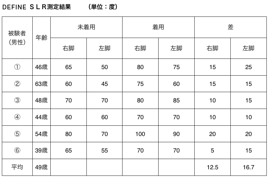 未着用と比較して、着用で右脚平均12.5度、左脚平均16.7度の柔軟性改善効果が見られた。