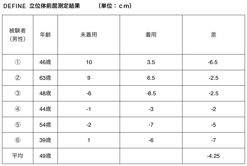 未着用と比較して、着用で平均4.25cm柔軟性改善効果が見られた。