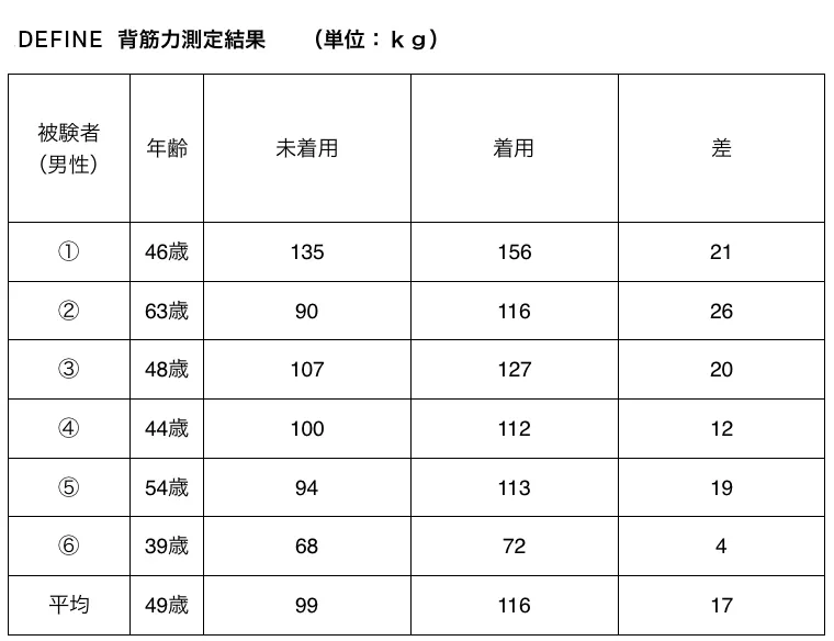 未着用と比較して、平均17㎏の背筋力UPが見られた。