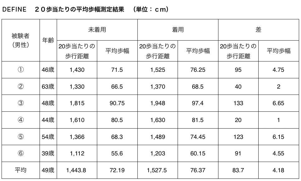 未着用に比べ1歩当たりの平均歩幅が4.18㎝広がった。