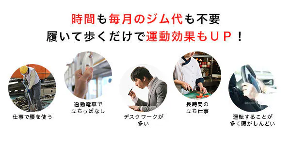 姿勢の悪さを指摘されたり、運動不足のせいで体調が悪かったりする方がいらっしゃるかと思います。しかし運動したくても時間がない、また始めたけれども続かない方 とても多いです。そういった方に履くだけで日頃の動きがしらずしらずのうちにニュートラルになるという効果が期待できます。