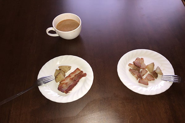 ・噂から、地元のホテル様、ゴルフ場のレストランなどで採用していただくまでになりました。☆試食のベーコン(ベーコンの油でいためたジャガイモを添えています)☆