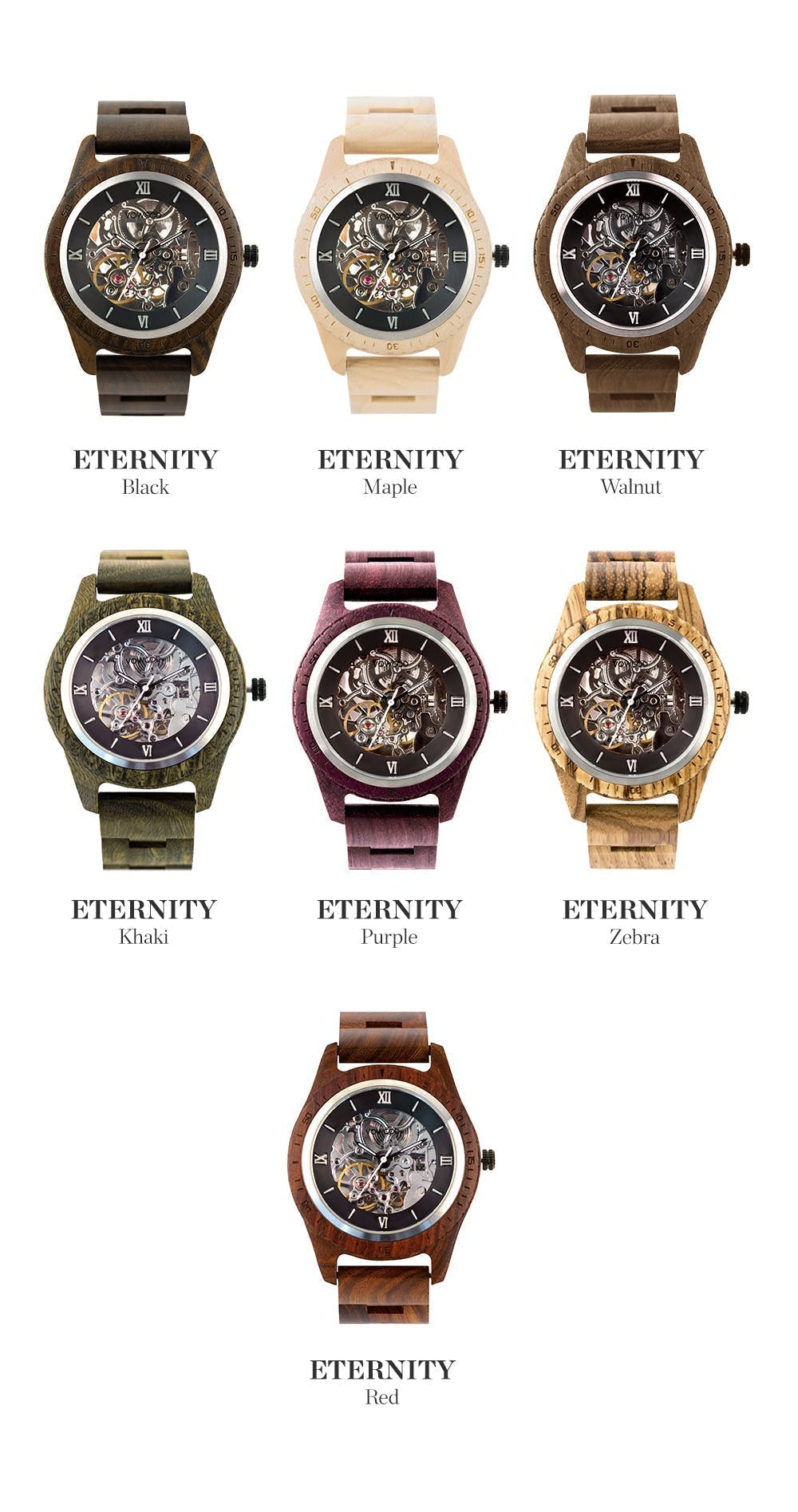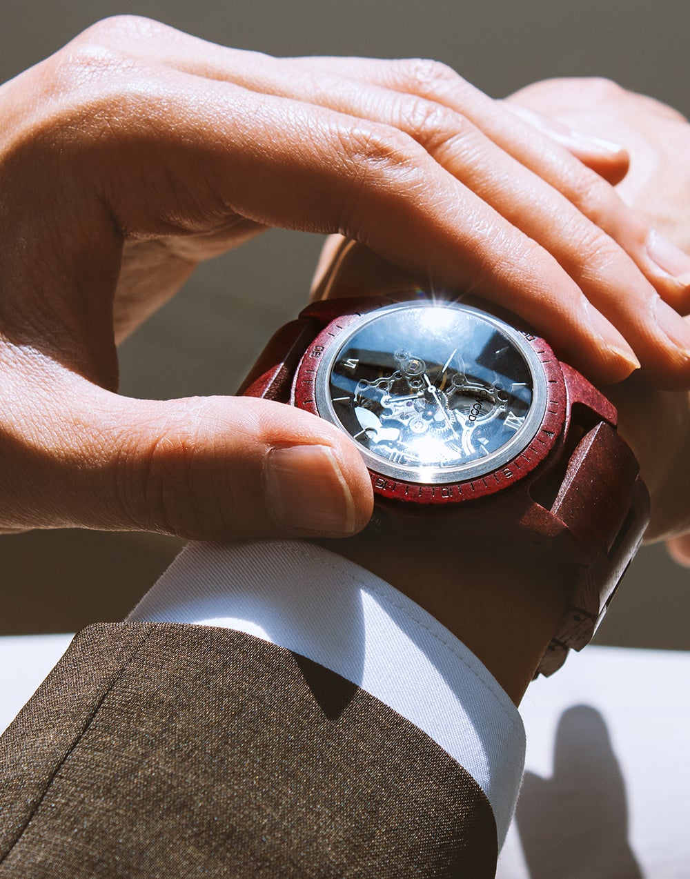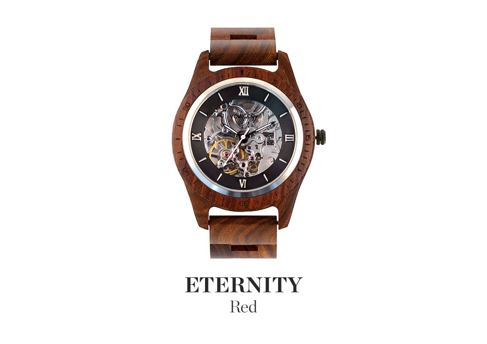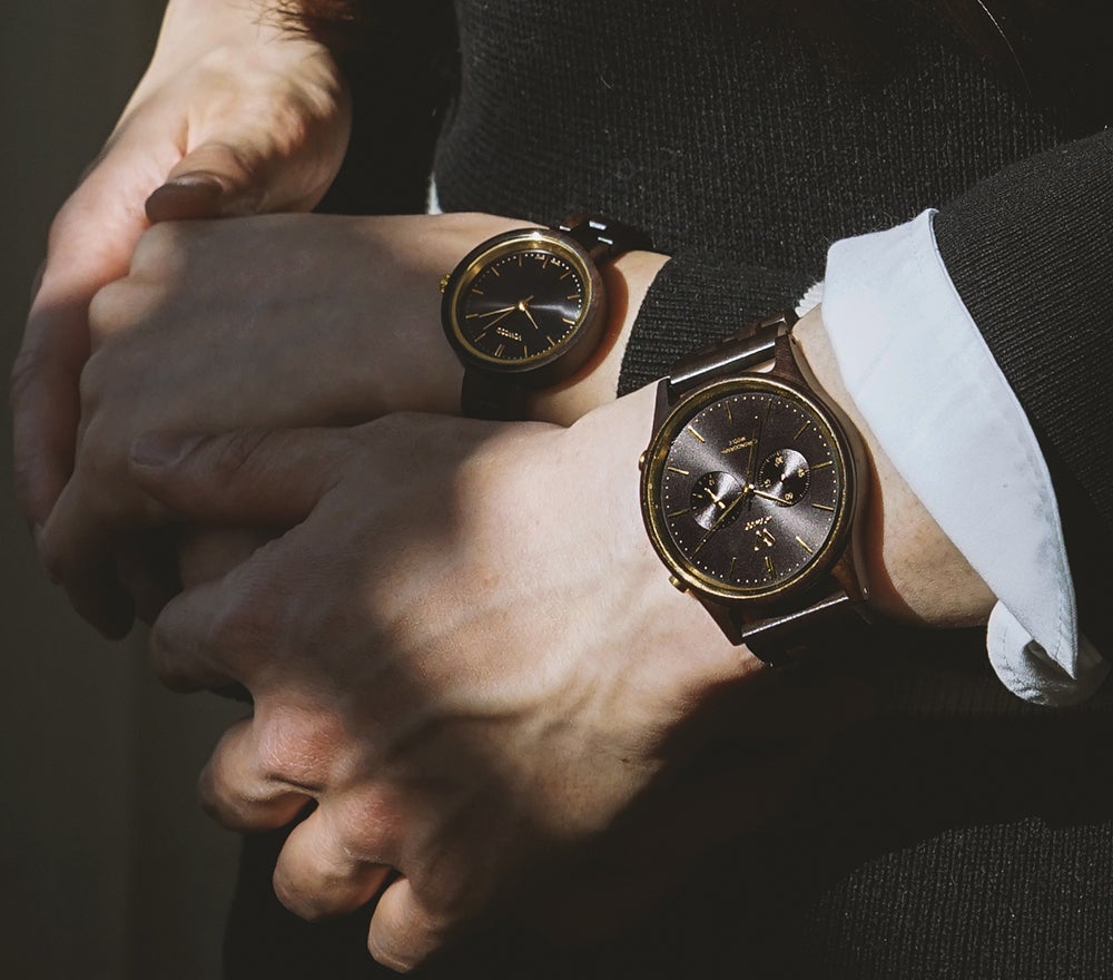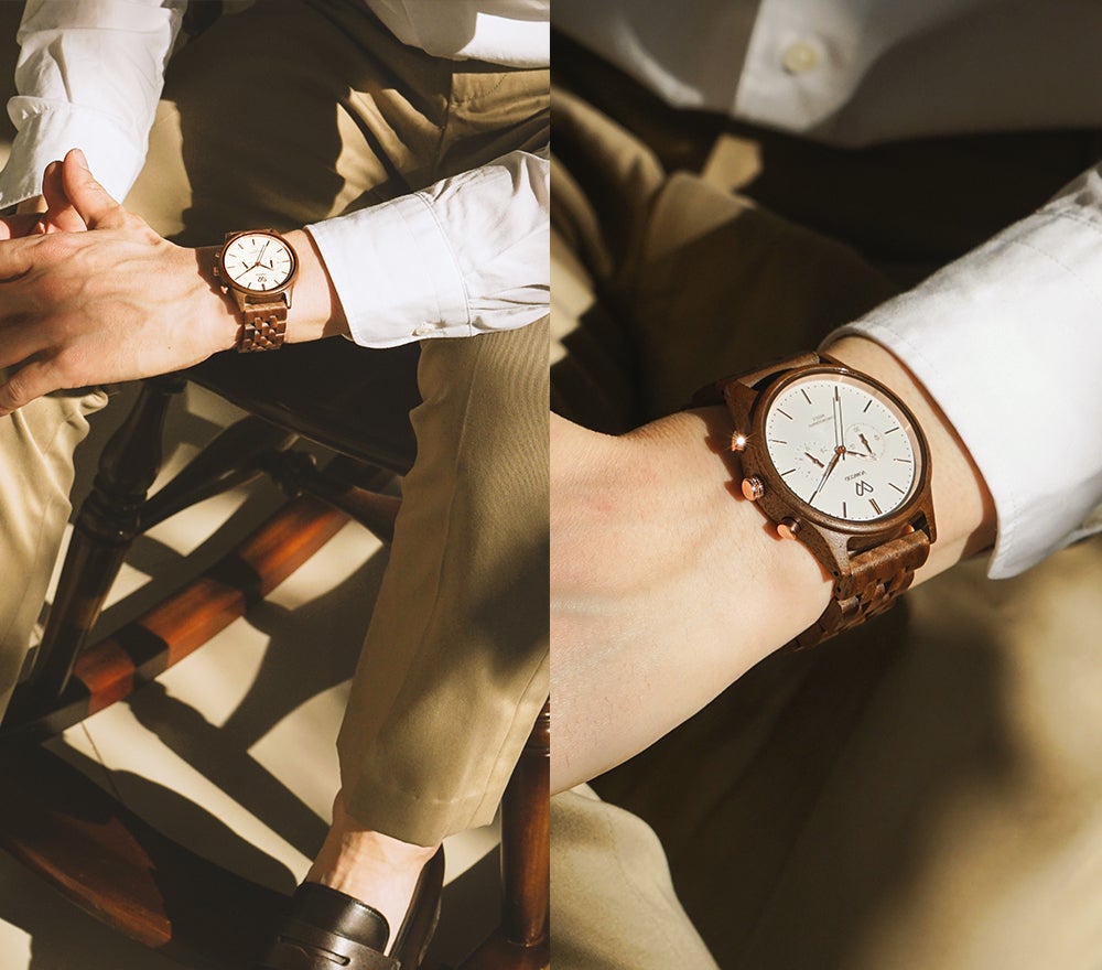 Vowoodのタイムピースは100%天然原木から作られるため、機械で鋳造するように大量生産することができず、ほとんどの製作過程は手作業(Hand-Crafted)で行われます。天然原木の時計はメタル時計と違って自然そのままの素材を利用しているため、「家具」のようなコンセプトを持っているとお考え下さい。同じ原木でも、それぞれ異なる色感、木目、模様、質感の特別な個性を持っており、時間が経つほどタンニングされ、より高級感を増していきます。