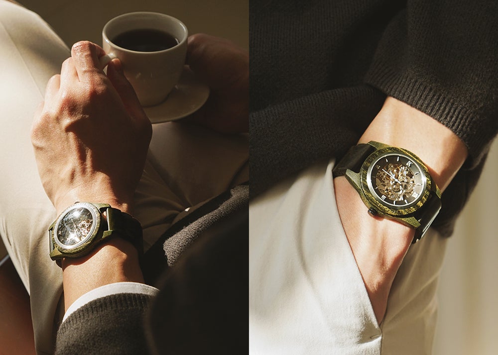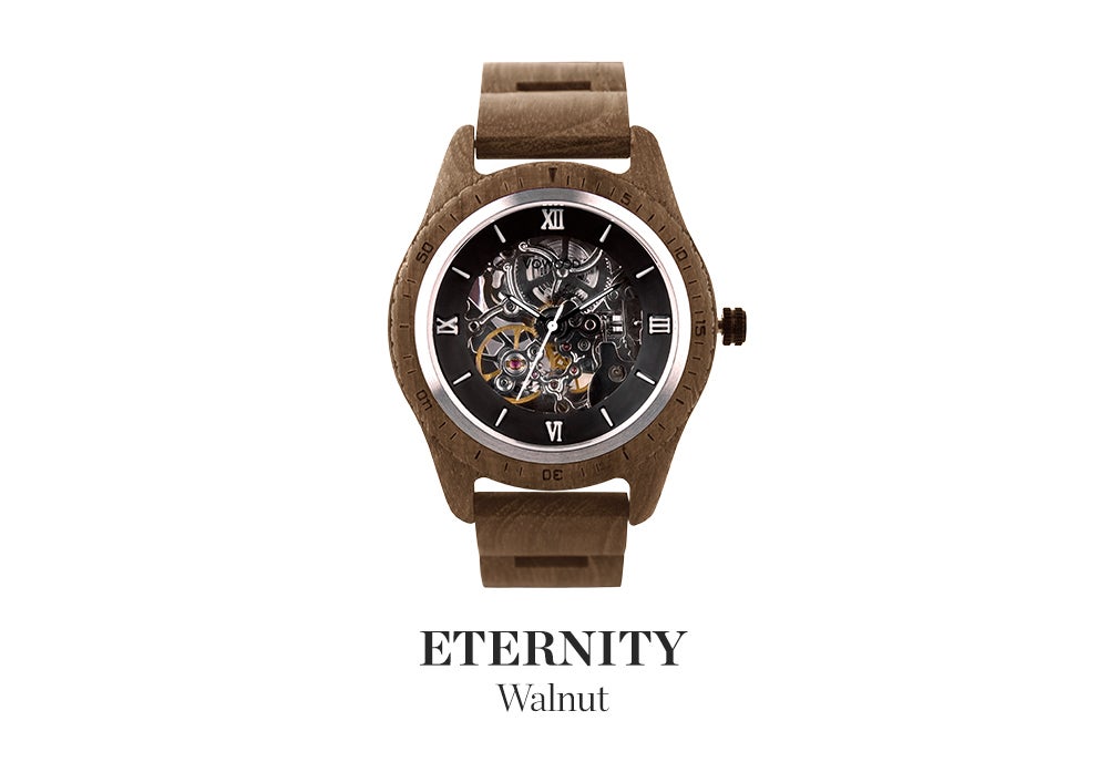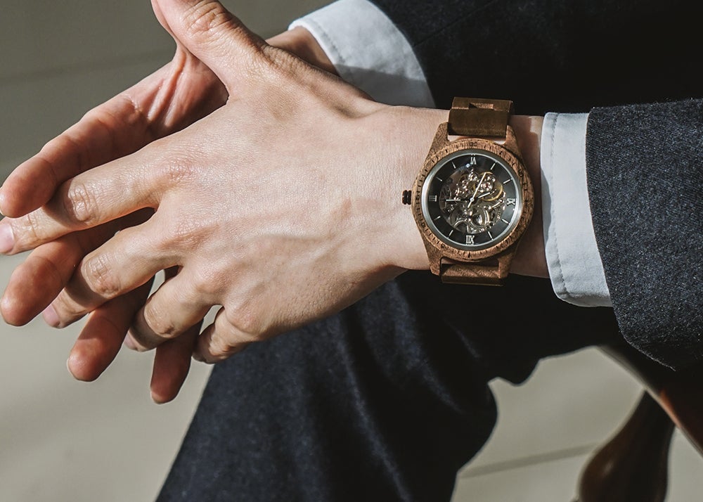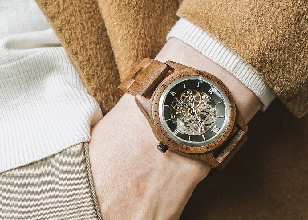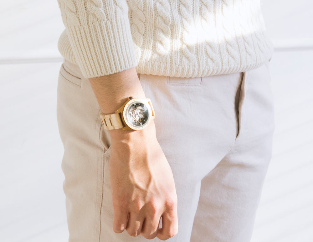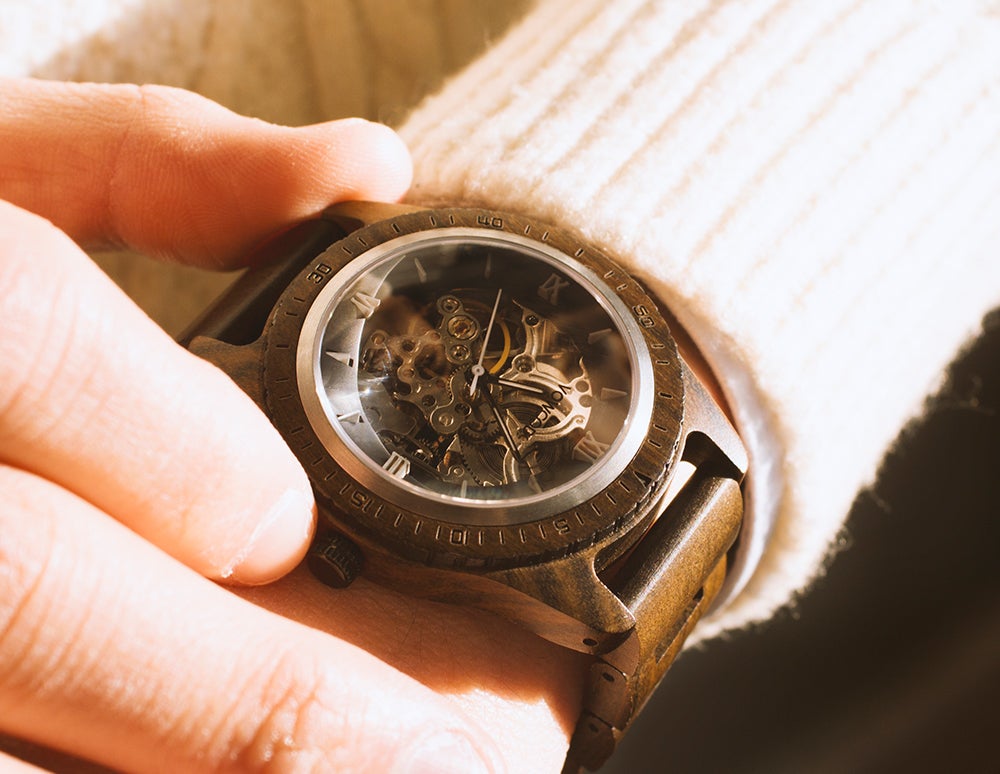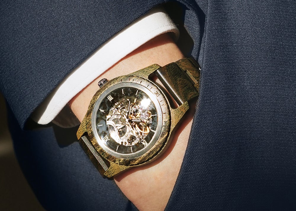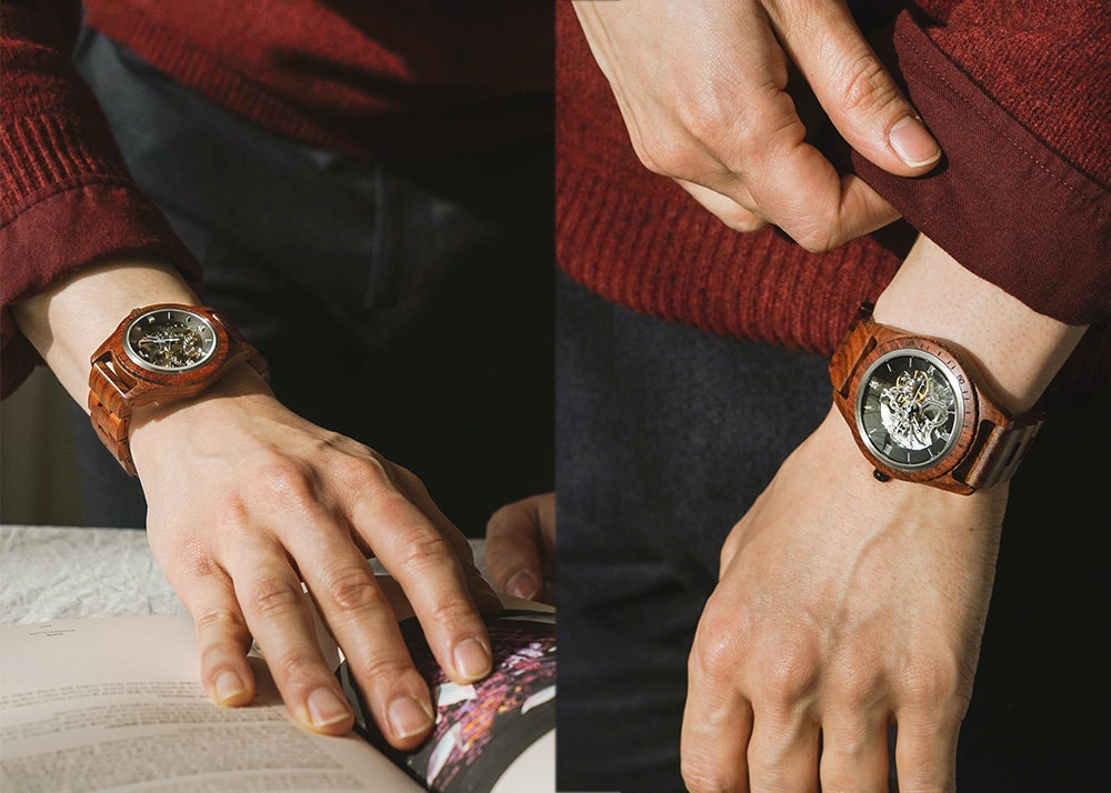 サファイアクリスタルガラスとセルフワインディングオートマチックムーブメントを搭載。5ATM防水機能が追加されたプレミアムウッドウォッチ
