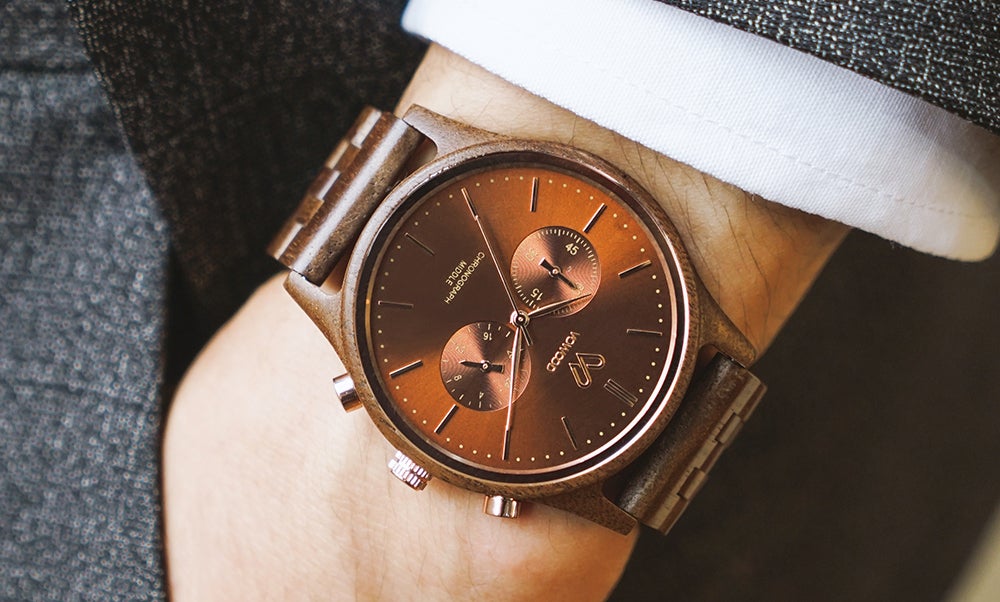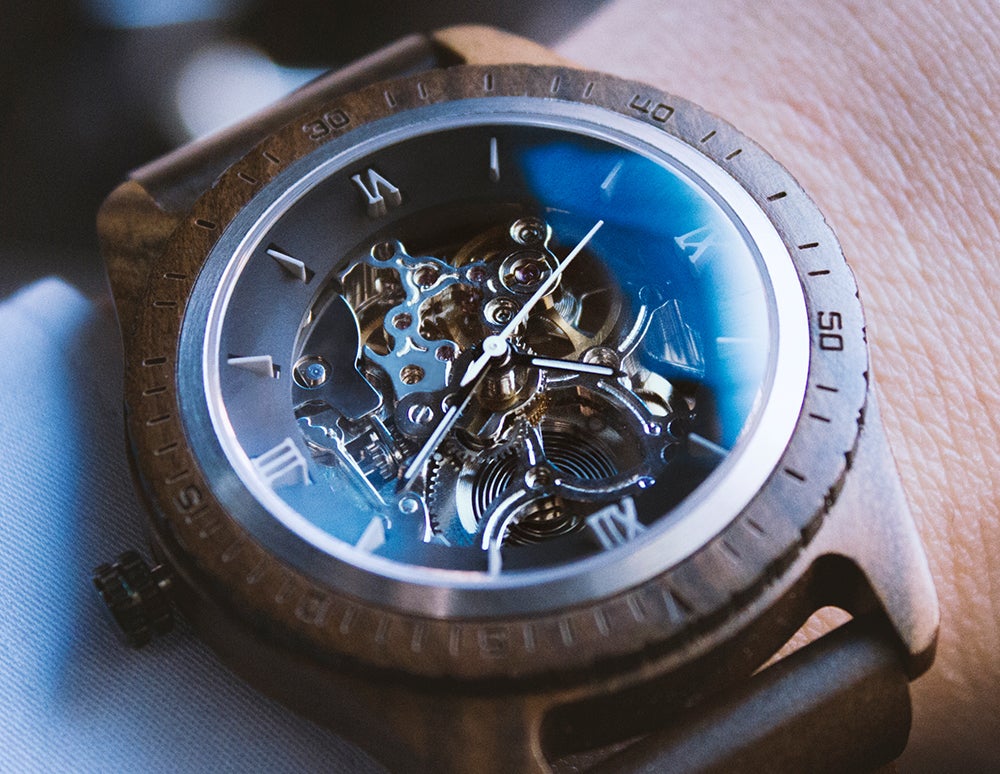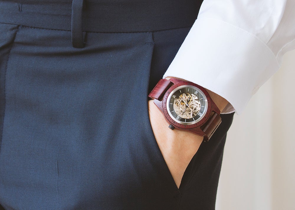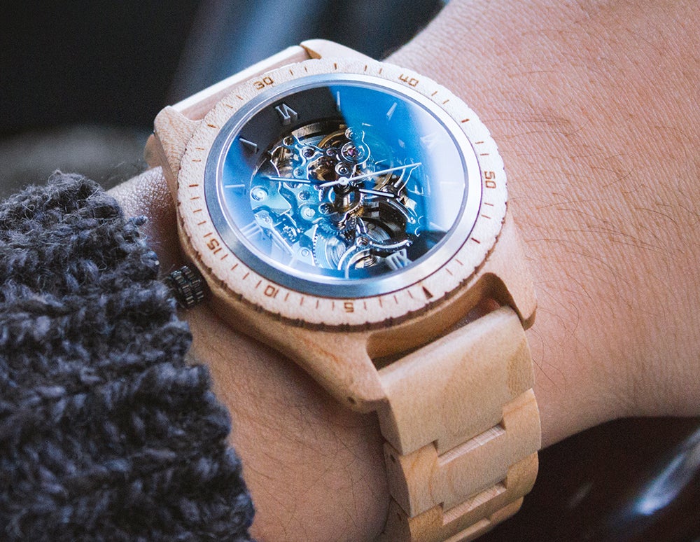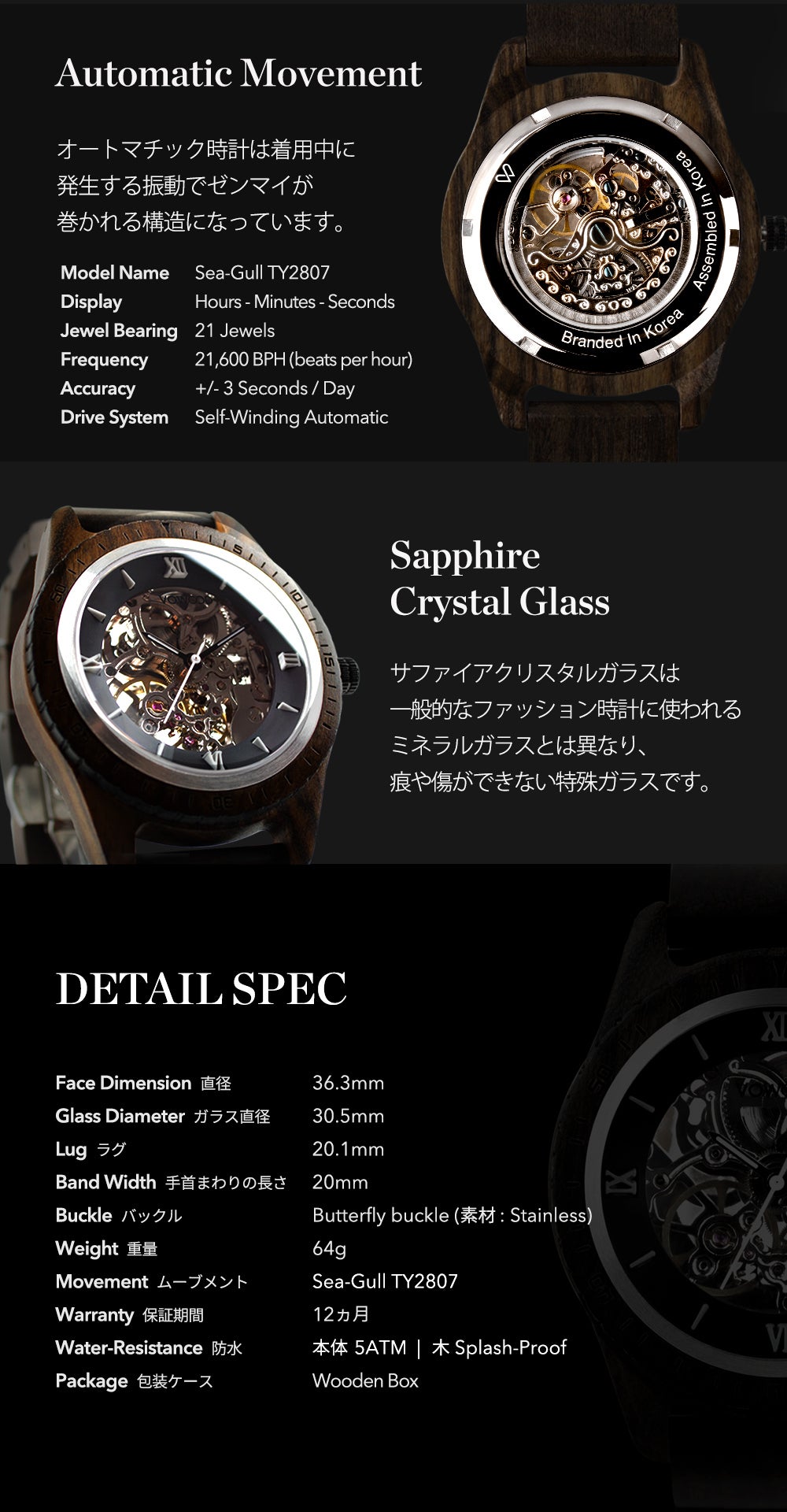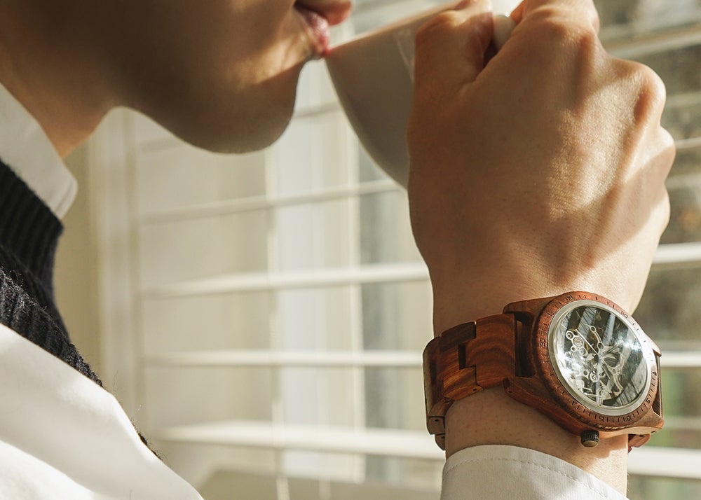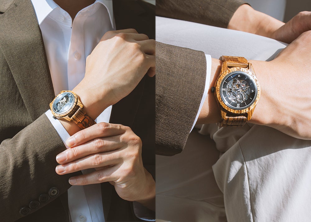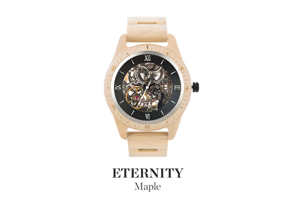 サファイアクリスタルガラスとセルフワインディングオートマチックムーブメントを搭載。5ATM防水機能が追加されたプレミアムウッドウォッチ