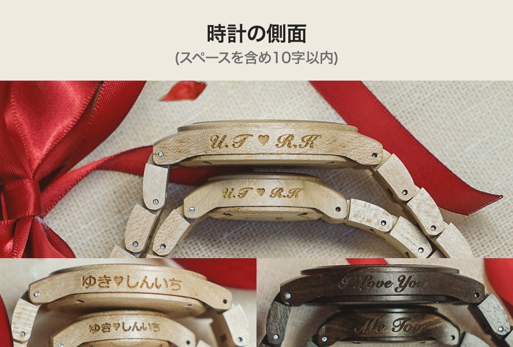 Vowoodでは、お望みのメッセージを時計の側面に刻印するサービスを実施しています。自分だけの愛のメッセージが刻まれたウッドウォッチは、この世でただ一つだけのものとなり、あなたの愛をより輝かせるでしょう。
