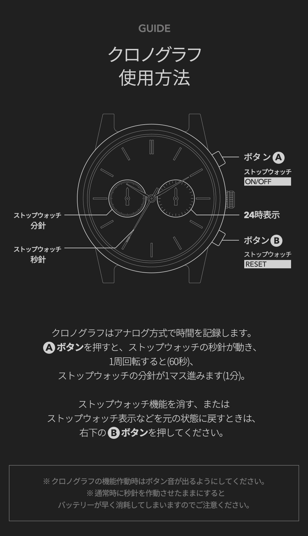 クロノグラフ機能とは、アナログ方式でストップウォッチ機能を利用できる装置です。ページの製品仕様の画像の下の方にクロノグラフ機能仕様方法について説明してありますのでお読みください。
