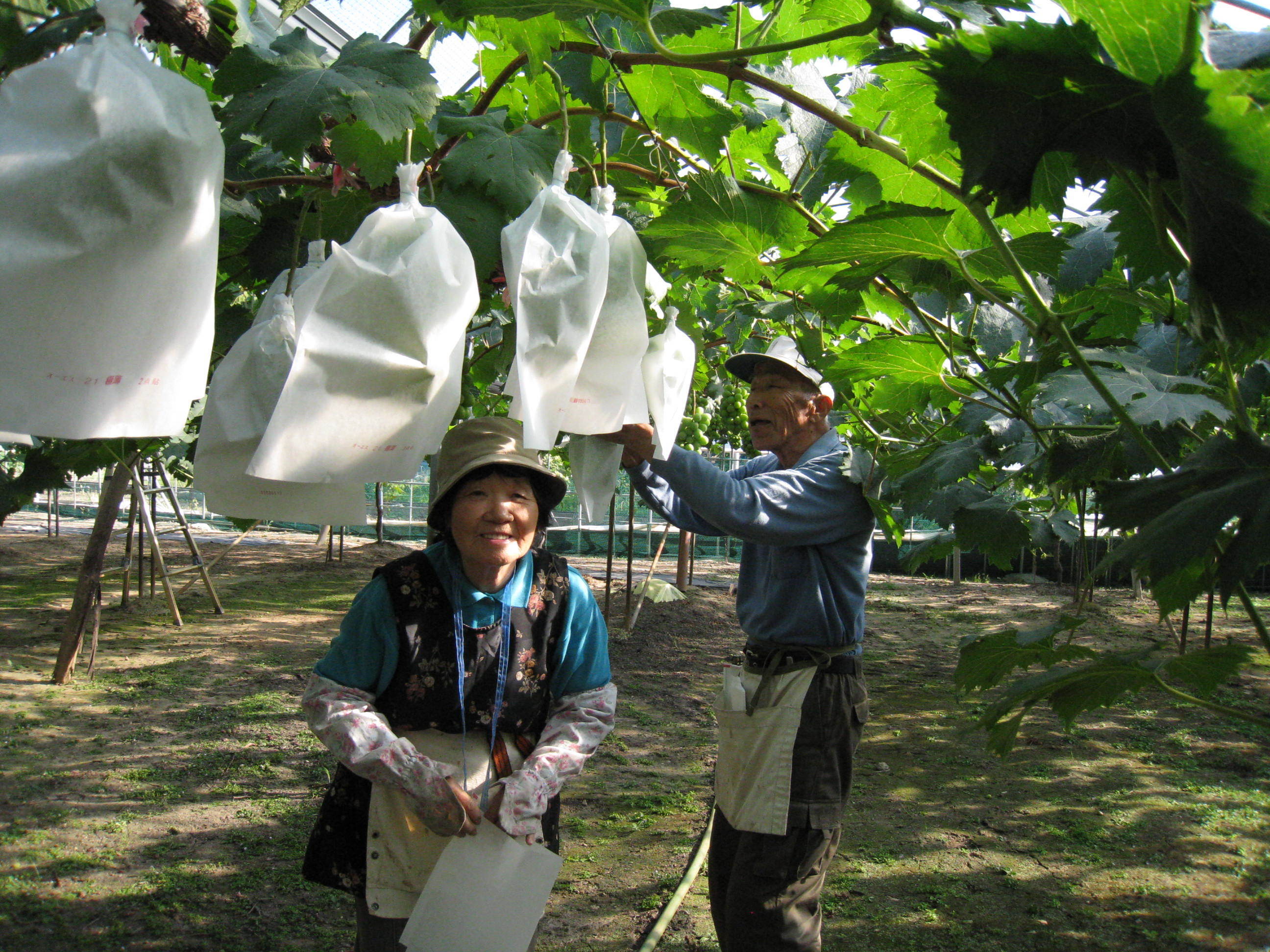 昨年5月下旬頃、袋掛けをしている写真です。両親もまだまだ健在で、頑張って手伝ってくれています。