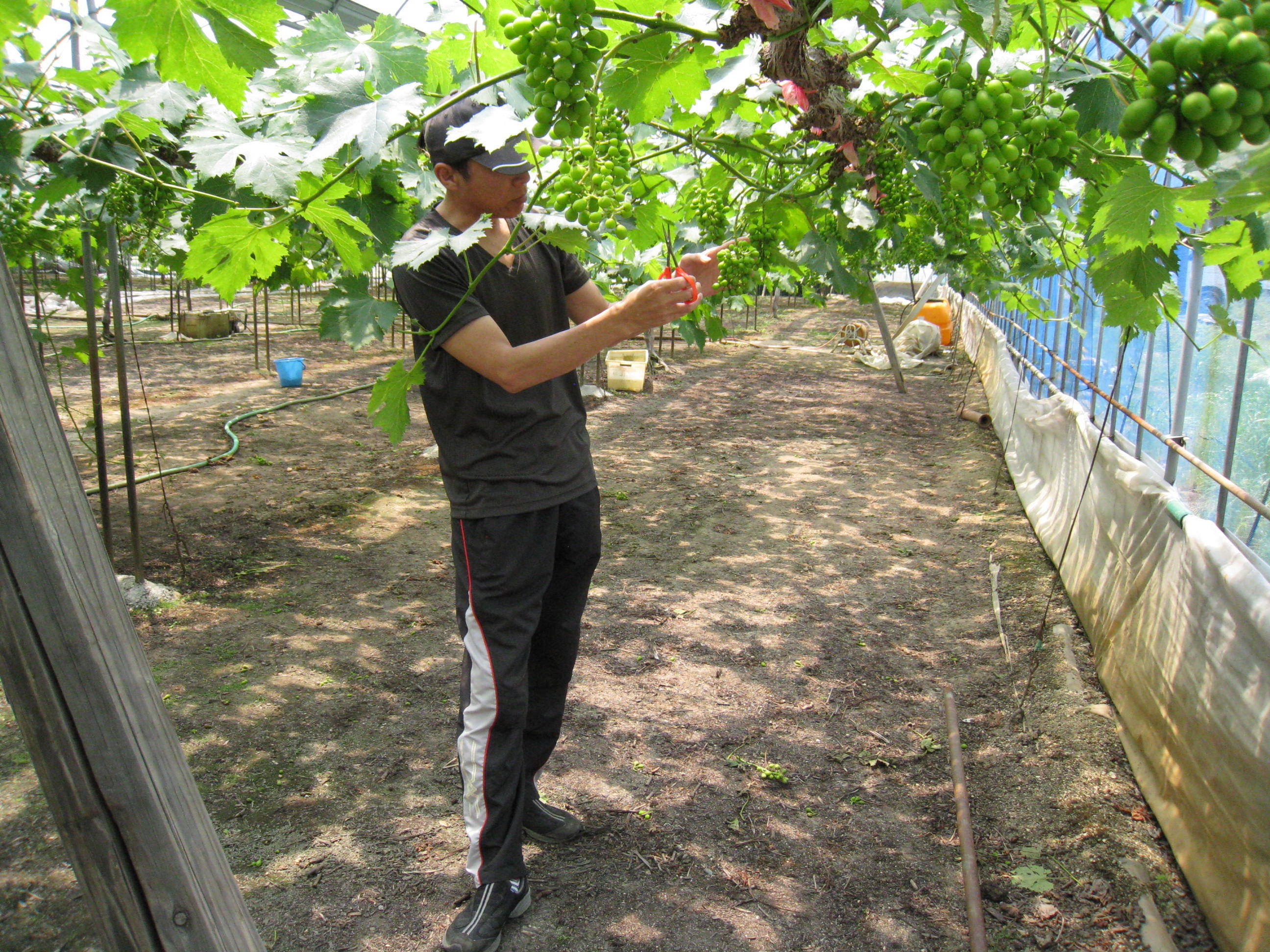 代表である私も頑張って働いております。ぶどうの形を整えている写真です。