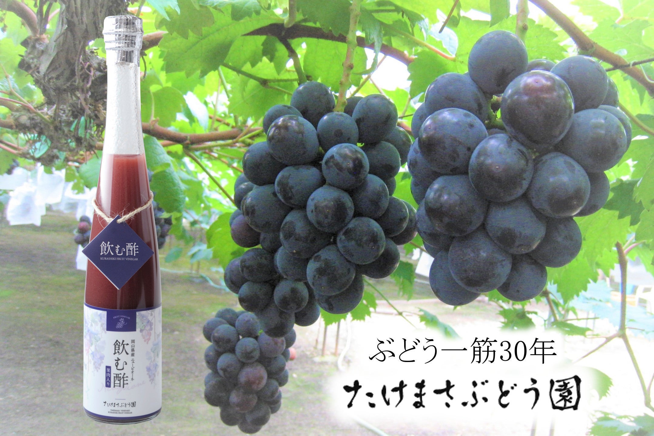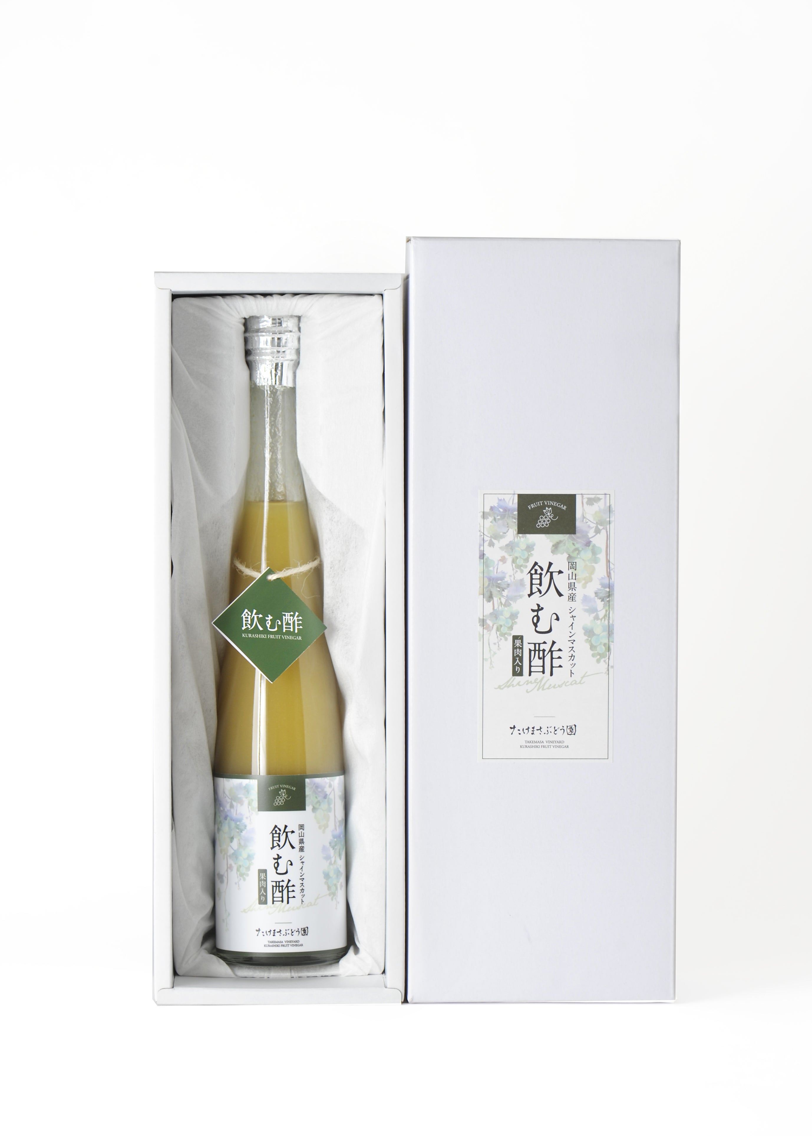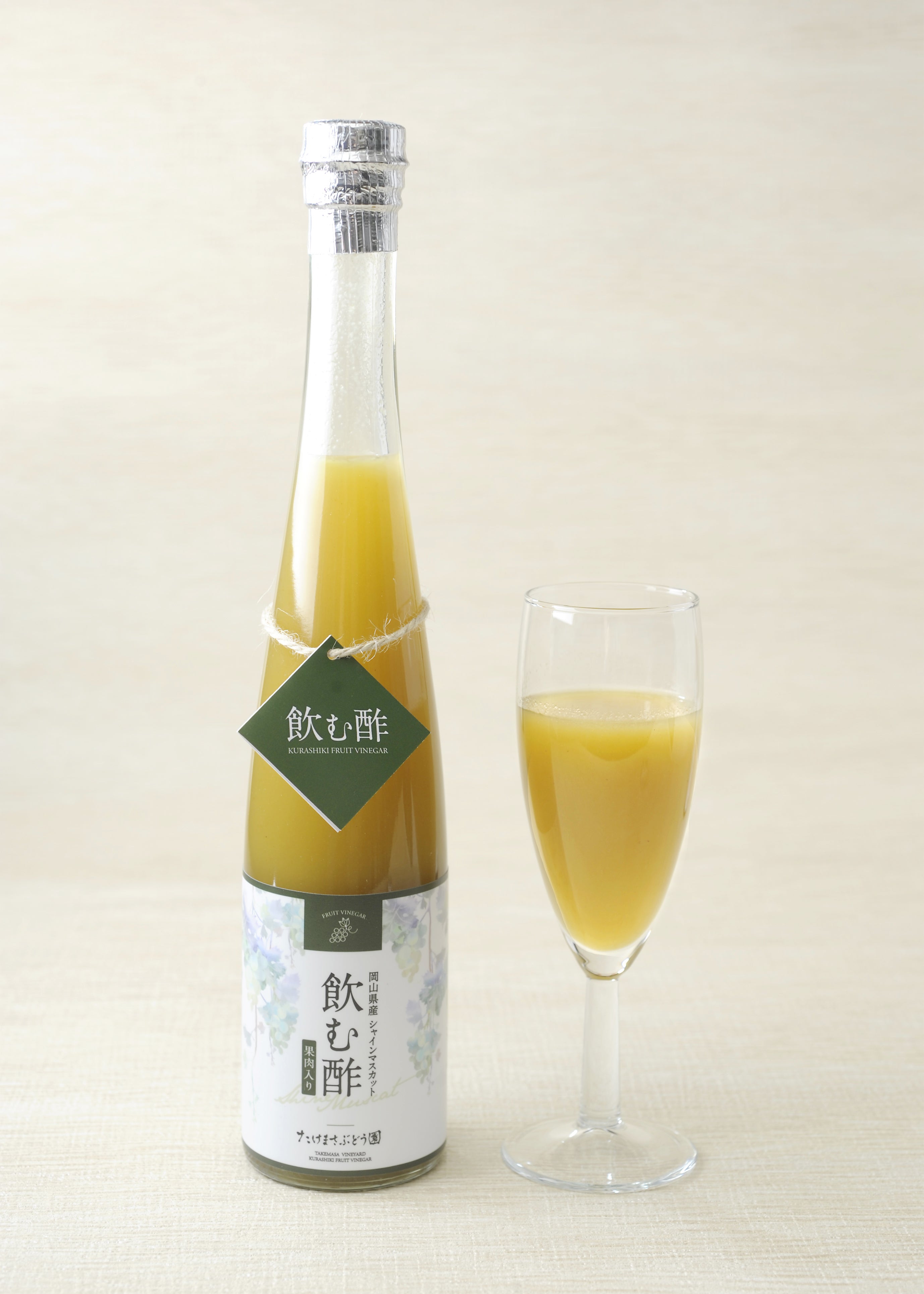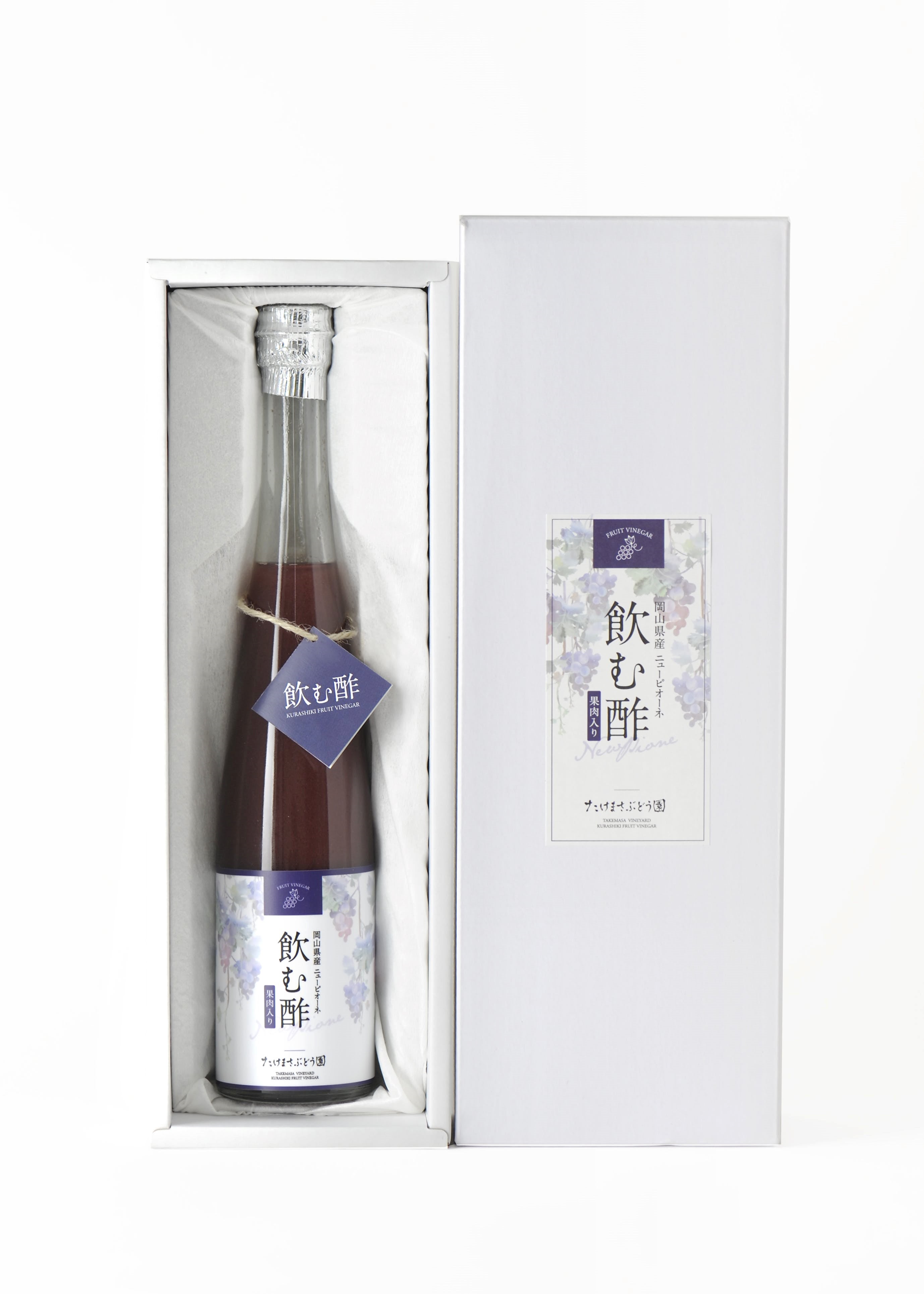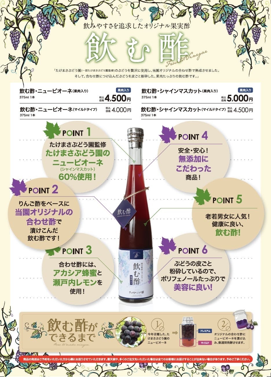 飲む酢(フルーツビネガー)は、多くの商品が出回っていますが、ぶどう農家が作っているぶどうの飲む酢は他にはない商品だと自負しております。独自に、合わせ酢をブレンドし、添加物は一切使っていません。また、当園で栽培したニューピオーネ(他のぶどうは一部監修)のみを使用しており、糖度16度以下のぶどうは使用しないなどのこだわりの最高級のぶどうを惜しげもなく使用して作りました。