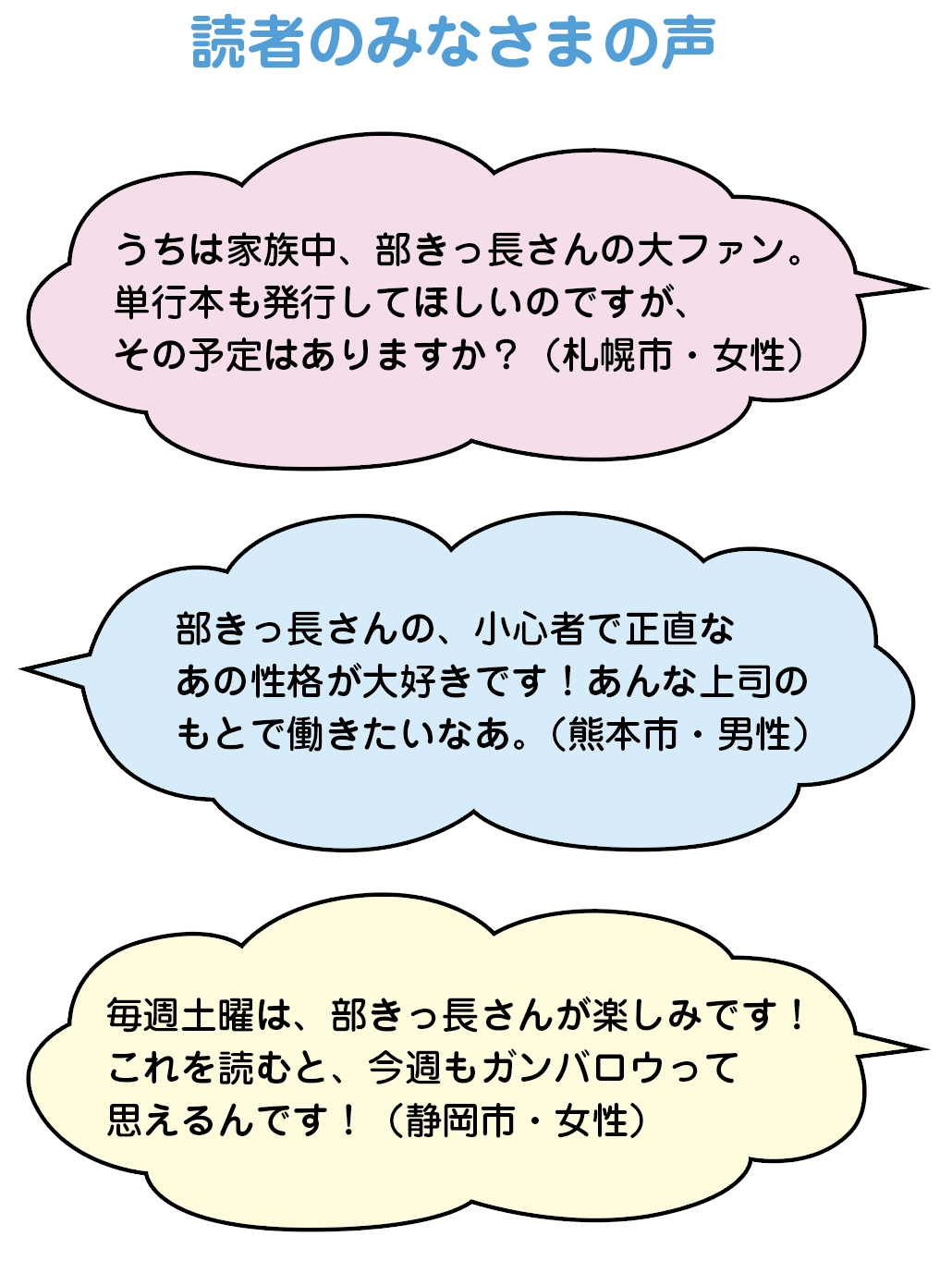 朝日新聞の土曜版「be」にて、2016年から、毎週、漫画を企画制作し、合計142話の作品を連載してきました。読者からも、「部きっ長さんに心からいやされます」「こんな上司がいたらいいのに…」といった、ありがたい葉書もたくさん届きました。ところが、今年の3月末に、朝日新聞の紙面改革による諸事情で、やむなく連載が打ち切りになり、「部きっ長さん」はリストラされてしまったのです。連載が終了したら、「部きっ長さん」も、この世から姿を消してしまいます。それではあまりにも寂しい…。そこで、改めてこれまでの全作品を単行本という形にして、みなさんに読んでもらいたい。お手元に持っていて欲しい。本棚に飾って欲しいと思ったのです。実際に、読者の方々から「単行本は、まだ出ないのか」というご要望もたくさんいただきました。「部きっ長さんよ、永遠に!」それが、このプロジェクトを立ち上げた理由です。