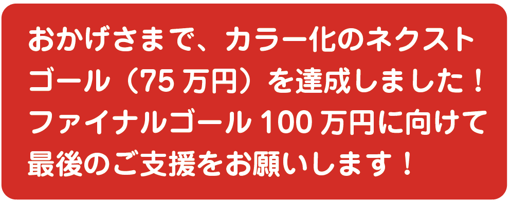 ご支援ありがとうございます!おかげさまで当初の目標の50万円を達成し、さらに漫画のカラー化をめざす75万円の目標も達成することができました!
