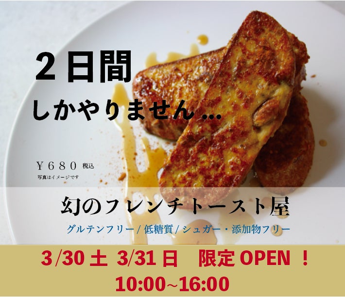 突然ですが..ケトローフを使ったトロけるフレンチトースト『ケトフレンチ』が楽しめるお店が3/30(土) 3/31(日) の2日間限定で大阪吹田市にオープンします!!体に良いのになんでこんなに美味しいの!?わけわかんない!!!と言いたくなるような体も心も満足するフレンチトーストを作りました。アーモンドがたっぷり入ったしっとり生地と、卵液とが合わさって中はもうトロットロ♡バタースコッチの香りのバターオイル ”キャラメライズギー ” がたっぷりのっています。ケトローフのシンプルな味が少し苦手..という人も『ケトフレンチ』ならきっと満足いただけるはず^^グルテンフリー / ローカーボ / ハイファイバーもちろん、シュガー& 添加物無添加 のケトローフを使った『ケトフレンチ』この機会に、ぜひ☺︎ーーーーーーーーーーーーーーーーーーーーーーーーーーーーー【2日間限定OPEN! 幻のケトフレンチ屋】3/30(土) 3/31(日) 10:00〜16:00数量限定、無くなり次第終了となります。最寄り駅:阪急北千里線 『千里山』徒歩2分場所:大阪府吹田市千里山西4丁目7-26 ラヴィール千里山103※イートインスペースはございません。テイクアウトのみとなりますので、ご注意下さい。