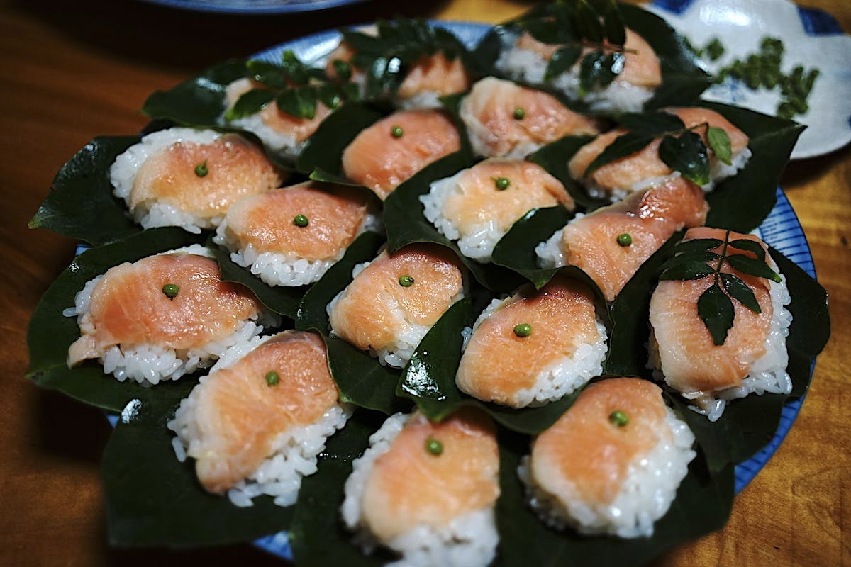柿の葉にマスの握り飯を乗せる。に土地の信仰と結びついた山の郷土寿司。
