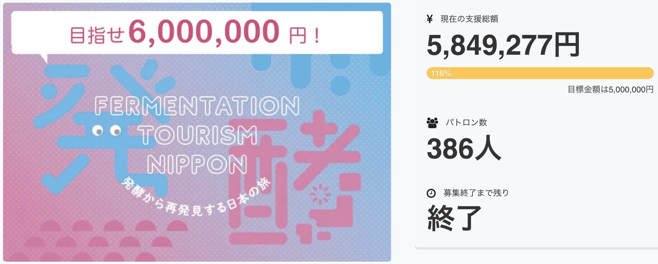 The plan to promote fermentation tourism in 47 prefectures has succeeded in raising a total of 5.85 million yen, thanks to the generous support from 386 investors.