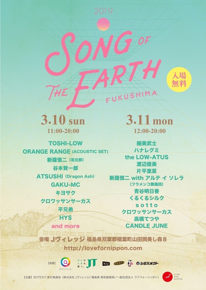 「SONG OF THE EARTH」は、「一般社団法人LOVE FOR NIPPON」の代表キャンドル・ジュン氏が、新潟中越地震支援として2004年から継続的に行なっているフェスティバル。新潟のほか、福島、熊本、西日本、北海道などでも、支援を行なっています。