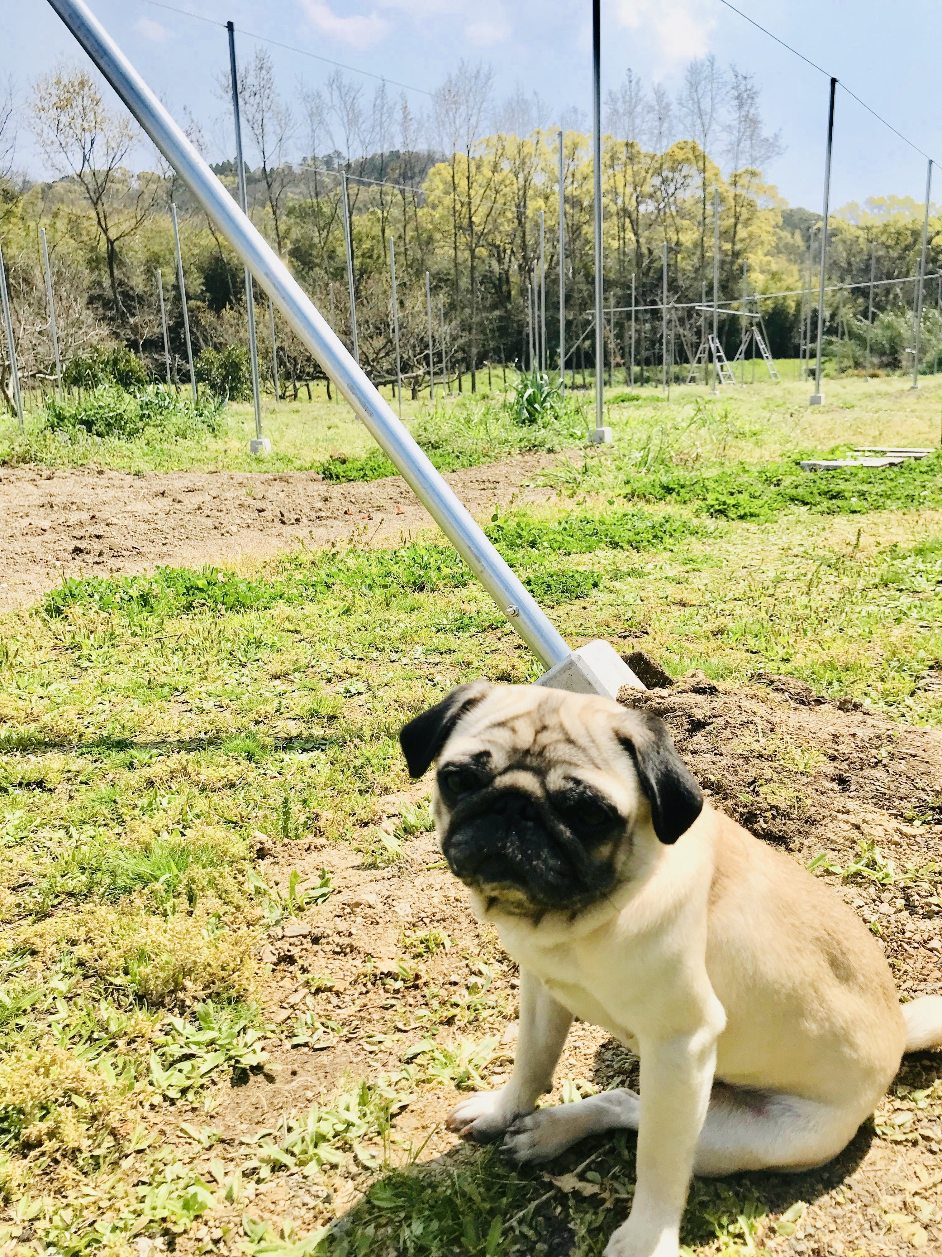 (ホップ畑で作業を見守る広報犬つくし)