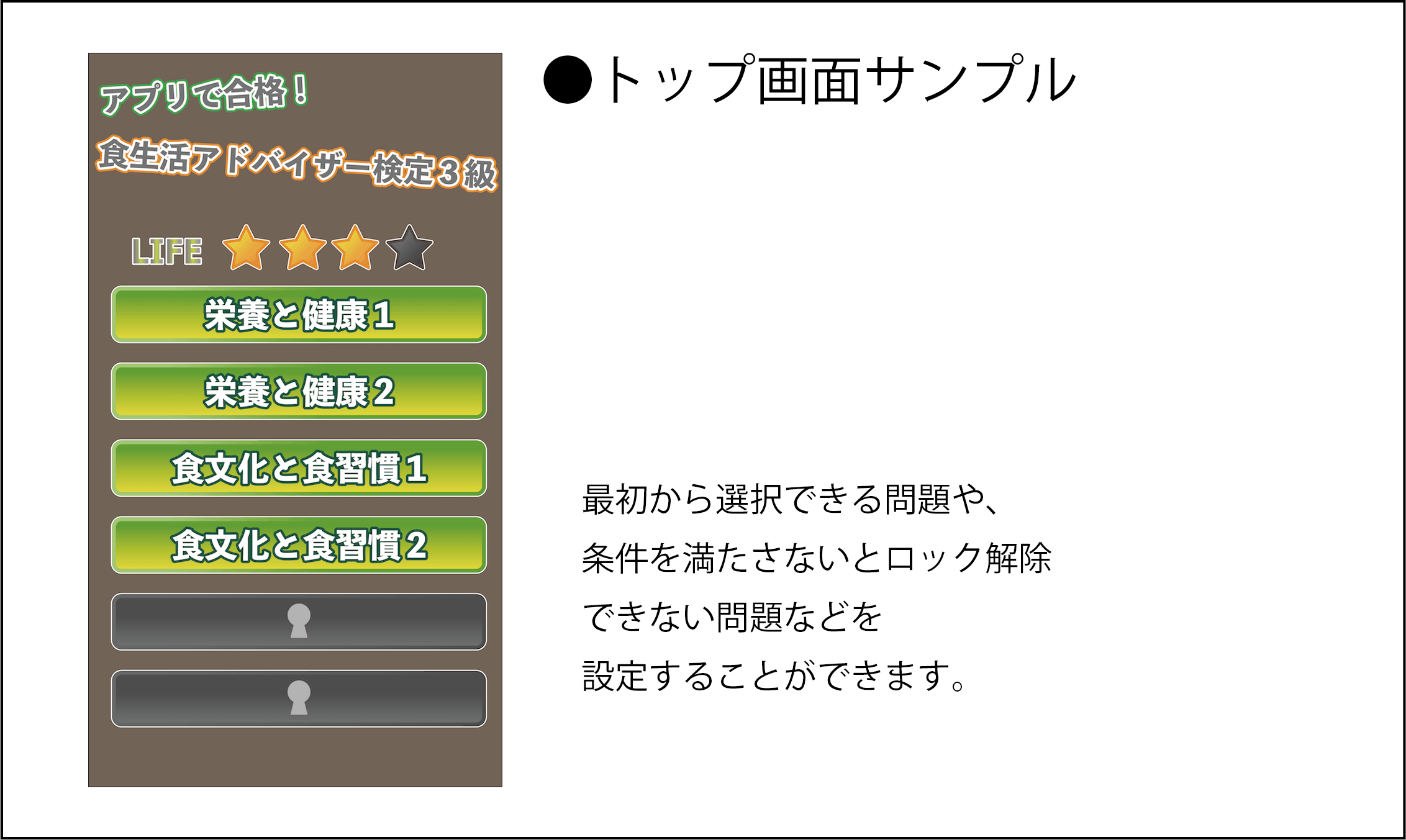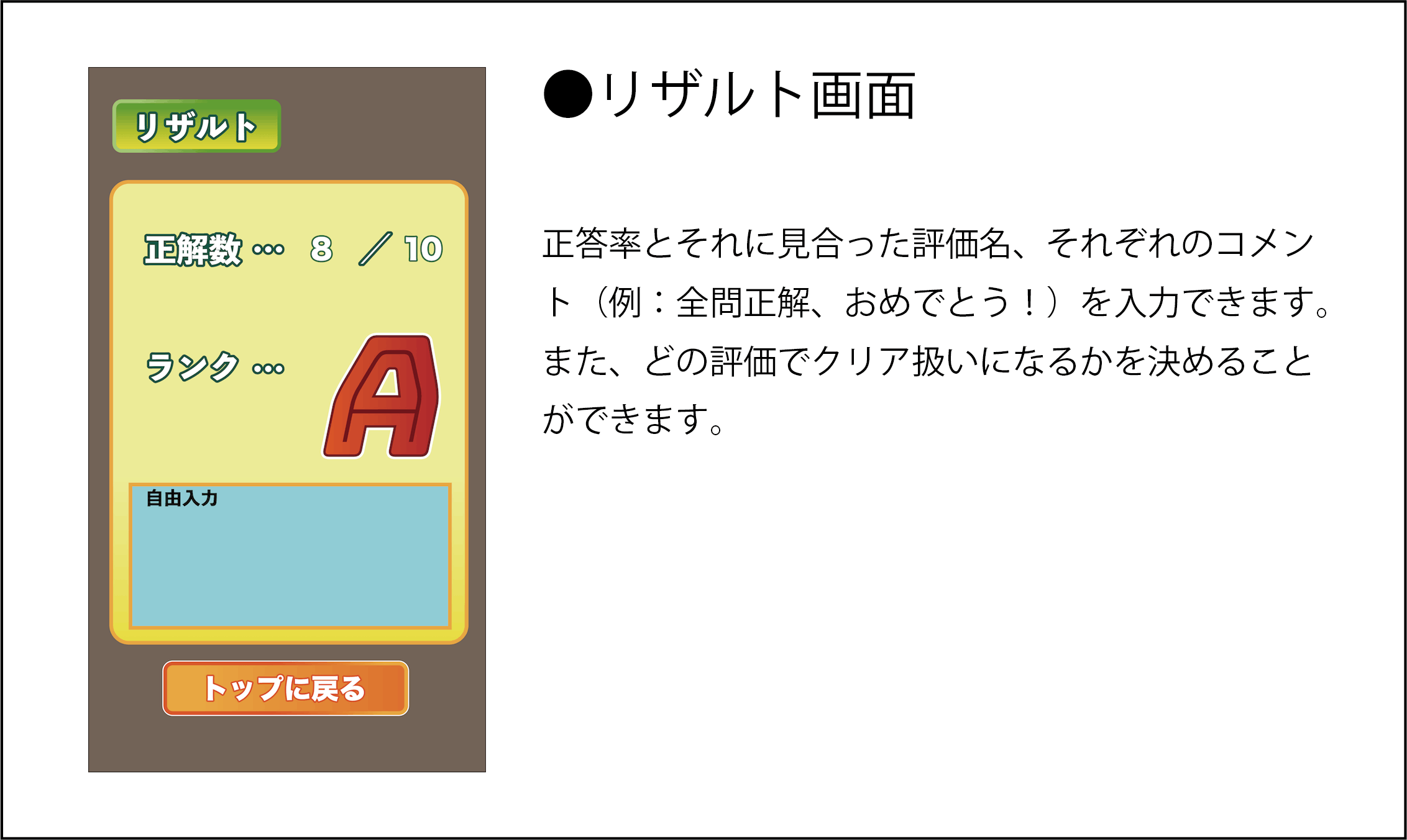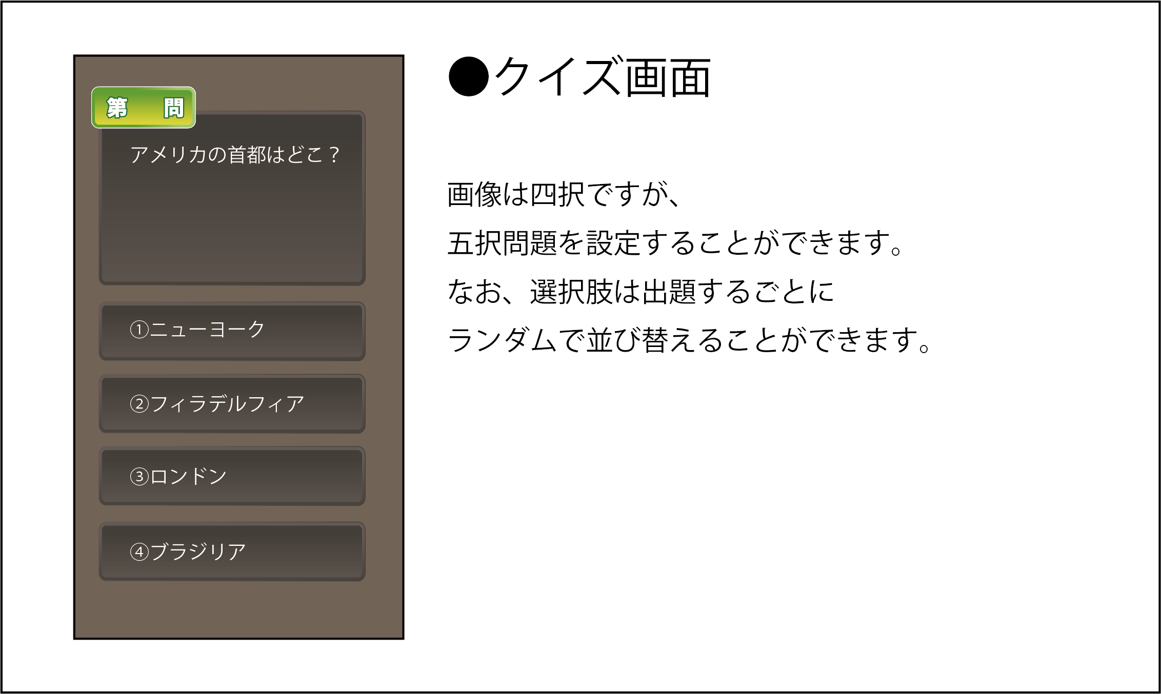マルバツ問題、五択問題といったクイズを作成することができます。