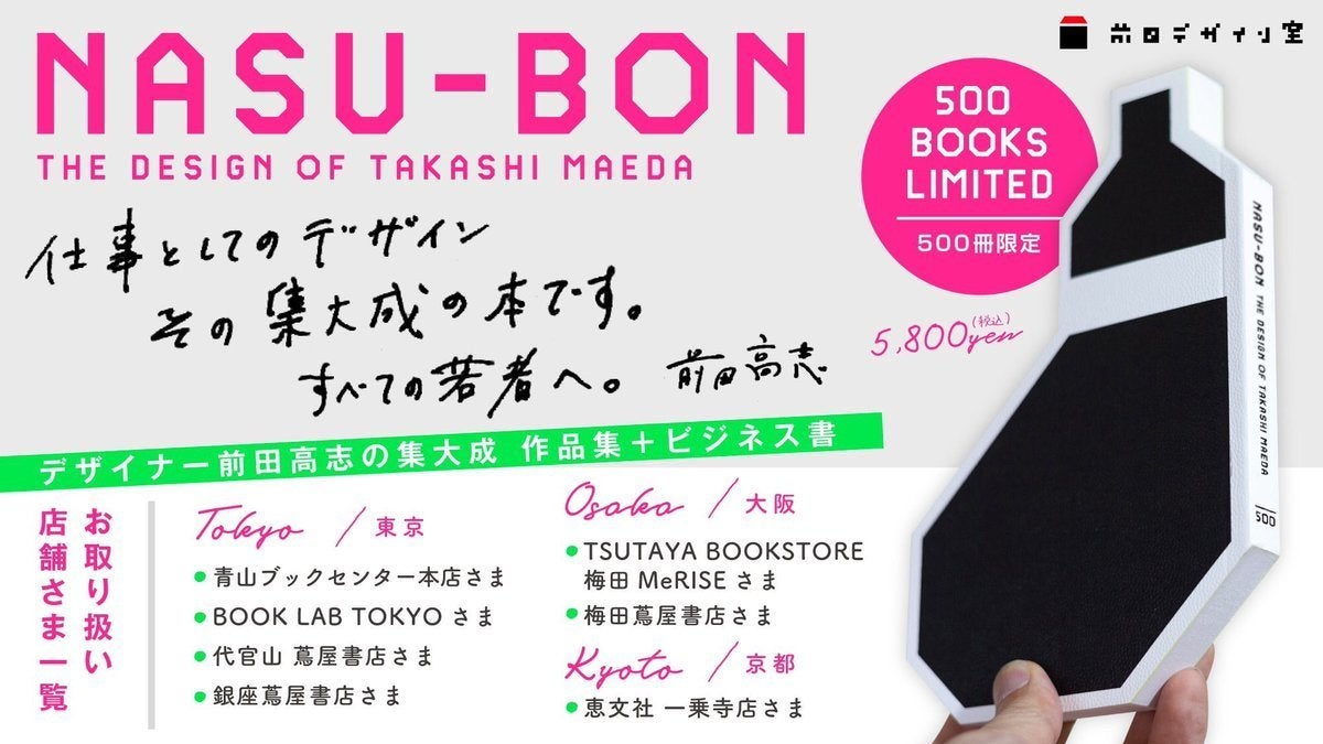 2019/06/18 20:38前田デザイン室の書籍『NASU本 前田高志のデザイン』編集長の浜田です。書店にてNASU本発売中です平成最後の日、平成31年4月30日に『NASU本 前田高志のデザイン』(以下、NASU本)が発売になりました。クラウドファンディングで予約販売していただいた皆様には配送が完了しているはずですが、万が一未着でしたら、至急こちらにお問い合わせください。 ↓↓↓mae-d@takashimaeda.jpさて、このNASU本ですが現在は東京、京都、大阪の一部の書店にて販売中です。NASU本を買うことができる書店はこちら。↓↓↓(デザイン:青木佳苗)中でも青山ブックセンター本店様には、インターネット番組「AOYAMA BOOK CHOICE」にてNASU本をご紹介いただきました!ご視聴はこちらから。ぜひご覧ください。↓↓↓https://www.lotuslotus.tv/video/887クラウドファンディングリターンの実施中クラウドファンディングで、クリエイターへのリターンをご支援いただいた方とのやりとりが続いています。完成したものをご紹介します。青木佳苗さんによるロゴリターン。ケイさんによるLINEスタンプ制作リターンは、前田さんが購入されたようです。前田さん(株式会社NASU)によるロゴ制作リターン。前田さんとの対談が記事になるリターン。前田デザイン室メンバーでもあるかもさんにご購入いただき、前田デザイン室メンバーで記事を制作しました。 ↓↓↓https://takashimaeda.jp/nasu-note/recommend-kamo/NASU本制作者たちがお届けする制作の裏側noteマガジン更新中NASU本制作メンバーが、リレー形式で制作過程の裏側をnoteに綴っています。現在25本記事があり、おそらく今後も増えます。お手元にあるNASU本を作ったクリエイター達の制作過程の舞台裏をぜひともごらんください。 ↓↓↓https://maeda-design-room.net/m/me0b8caceb150イベントのお知らせ7月3日代官山蔦屋書店様にてNASU本刊行記念イベントが開催されます! ↓↓↓https://store.tsite.jp/daikanyama/event/humanities/7186-1748400531.html前田デザイン室代表の前田高志と、博報堂クリエイティブディレクター細川剛との対談です。この二人は大阪芸術大学デザイン学科の同級生。前田さんは任天堂を経て独立しNASUを設立。細川さんは博報堂のクリエイティブディレクターとしてご活躍です。NASU屋号誕生のきっかけの裏側には、細川さんからのアドバイスがあったようです。また前田デザイン室初の雑誌『マエボン』をGOOD DESIGN賞に出してみては?とアドバイスをくれた人でもあるのだとか。時に同級生として、時にライバルとして歩んできた二人。20年分の答え合わせが聞けるイベントになりそうです。7月3日代官山蔦屋書店にて開催予定。チケットのお申し込みはこちらから。 ↓↓↓https://store.tsite.jp/item-detail/humanities/16002.html多くの方にご来場いただけることを楽しみにしております。またNASU本に関して動きがありましたら報告いたします。NASU本編集長浜田綾 もっと見る