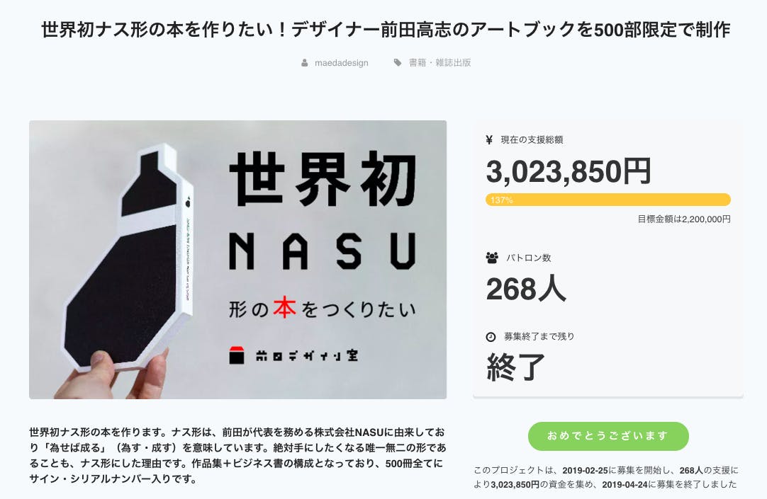 2月25日から開始した、『NASU本 前田高志のデザイン』クラウドファンディングプロジェクトは、24日の24時をもって終了しました。