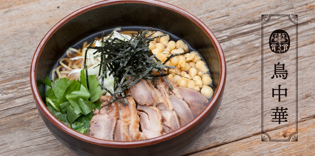 天童市のそば屋で生まれた、鶏だしに甘みのある和風な味つけの中華そば。親鶏のチャーシュー、三つ葉、ねぎ、あげ玉、きざみのりが乗る。