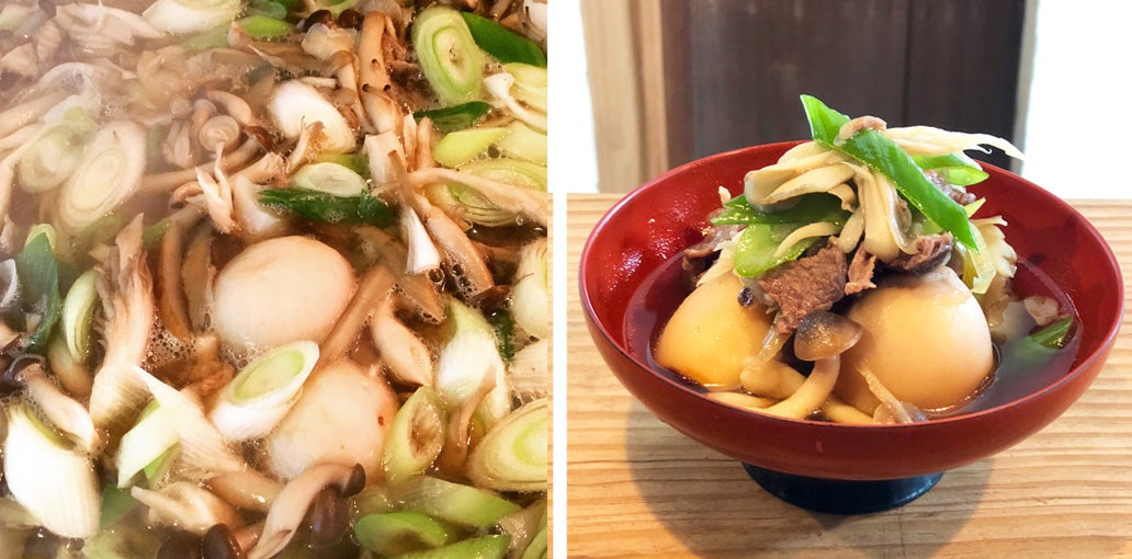 主な具材は、さといも・牛肉・ねぎ・ごぼう・こんにゃく・きのこ、味つけはしょうゆ味。牛肉ではなく豚肉を入れて味噌味で食べる地域も。