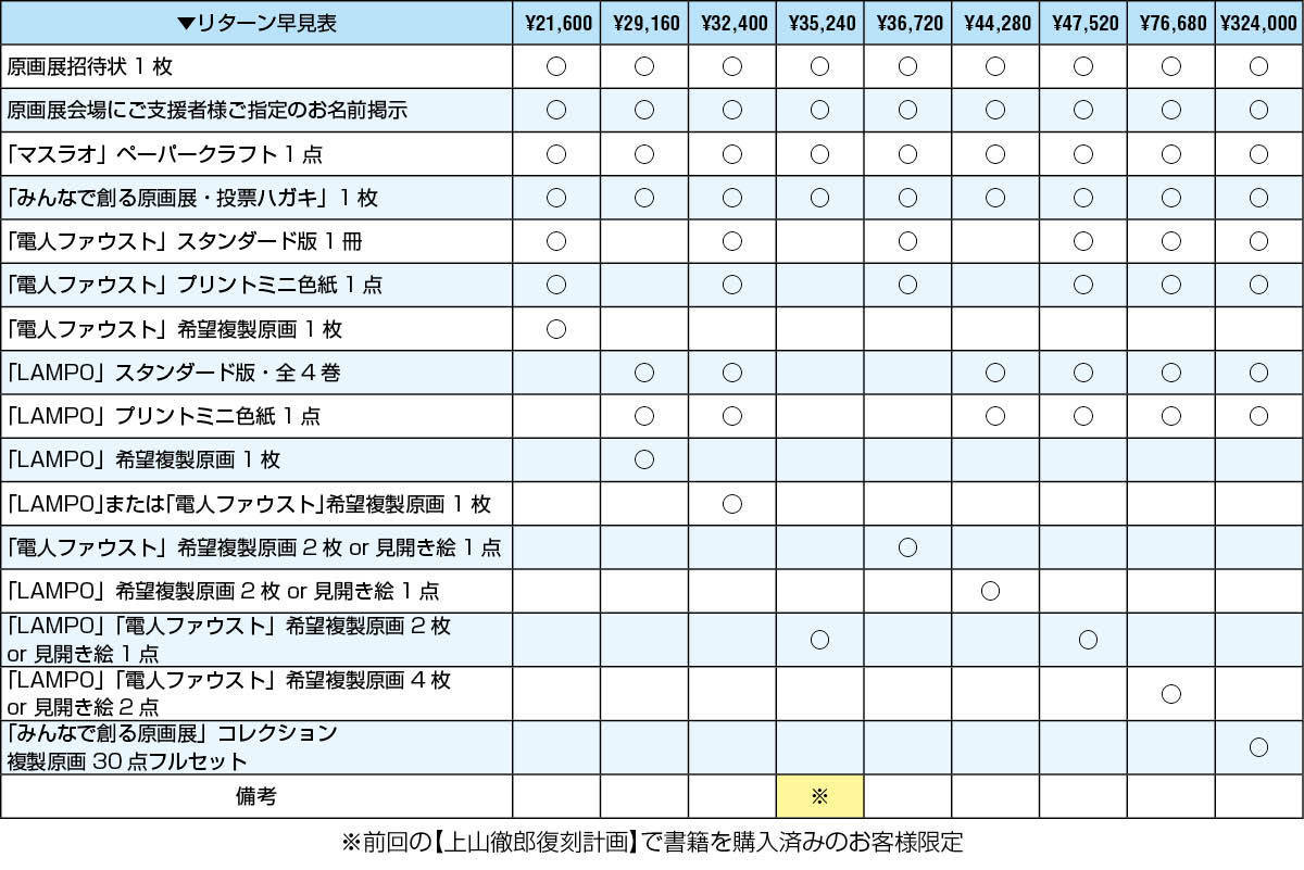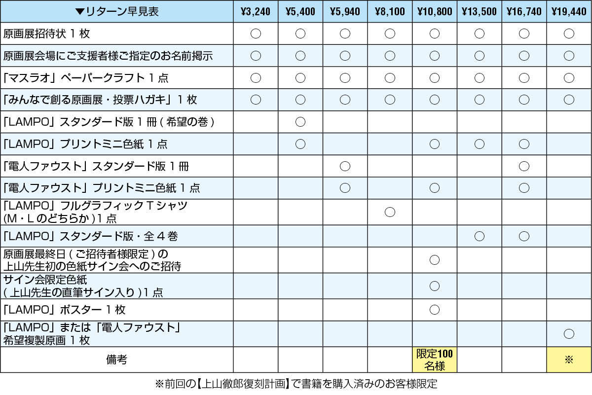 前回の【上山徹郎復刻計画】で「LAMPO」「電人ファウスト」のプレミアム版、スタンダード版を購入済みのお客様限定でお申込みいただけるコースです。