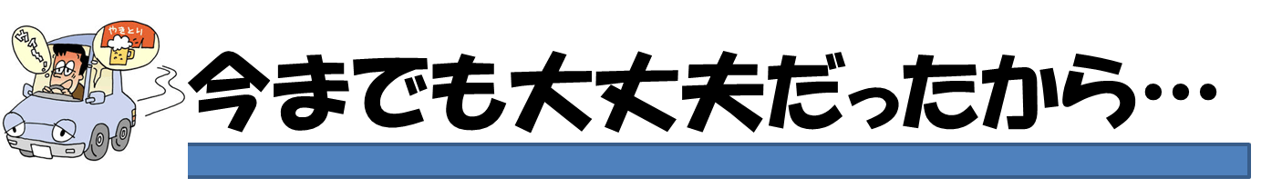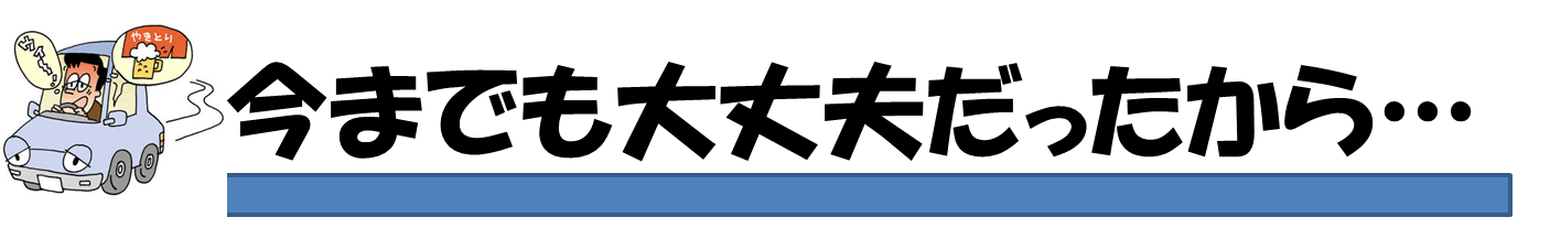 ●お酒を飲んでも大丈夫!!。ちゃ~んと運転ができるし、自信があるよ。今まで捕まったこと無いしね。運転代行も、車を置いてタクシーで、帰っても、駐車代金も高いしさぁ~、お金が勿体無いんだよねぇ。
