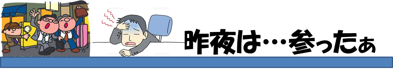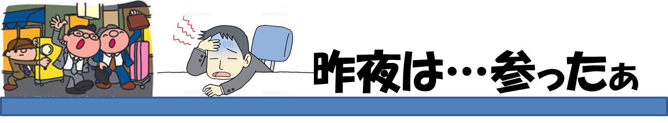 ●参った、昨夜は深酒で、ちゃんぽん効いたな~。しかも、また、さぁ...。あの○○会社の課長さぁ~返してくれなくて...。「さぁ、○○君!!、あと、あと、もー1件行こっ」。「いゃ~まだまだ行くよぉ~」って、また始まちゃてさぁ...。朝4時までだよ。参ったよ...。でも、今日、朝一で取引先に納品に行かなきゃまずいんだよね。あぁ~頭痛い。おぃおぃ、ちょっと頼むよ、あの会社、時間にうるさいんだからさぁ。解ってますって、大丈夫ですよ、きちんと、今、行ってきますから。