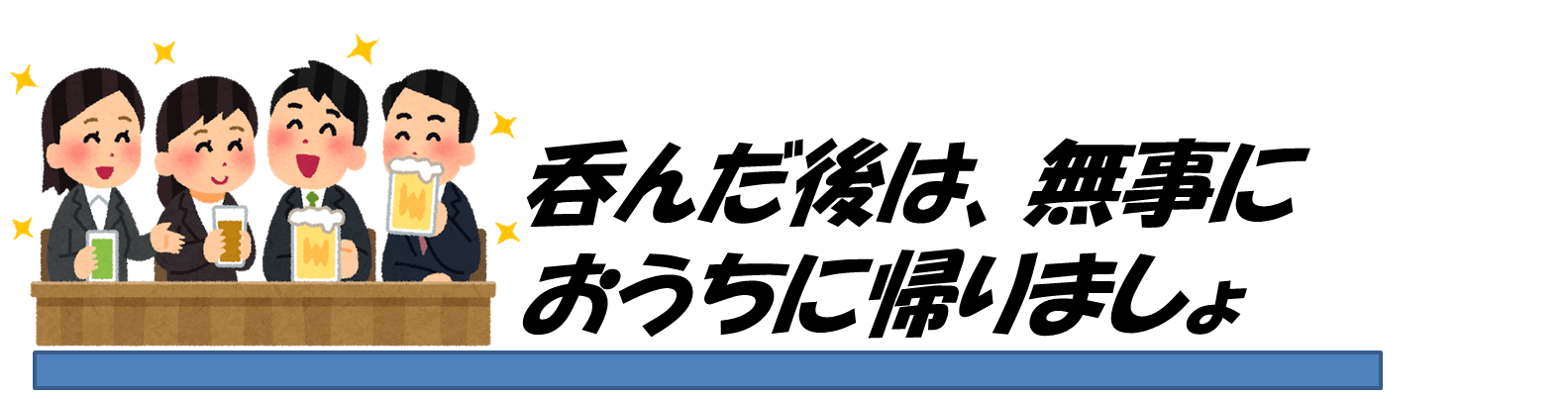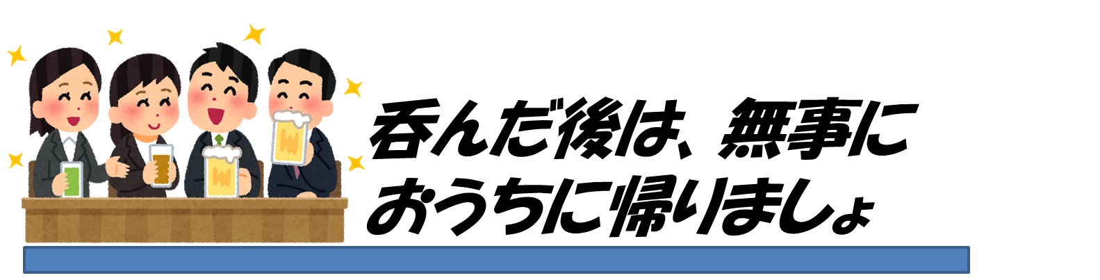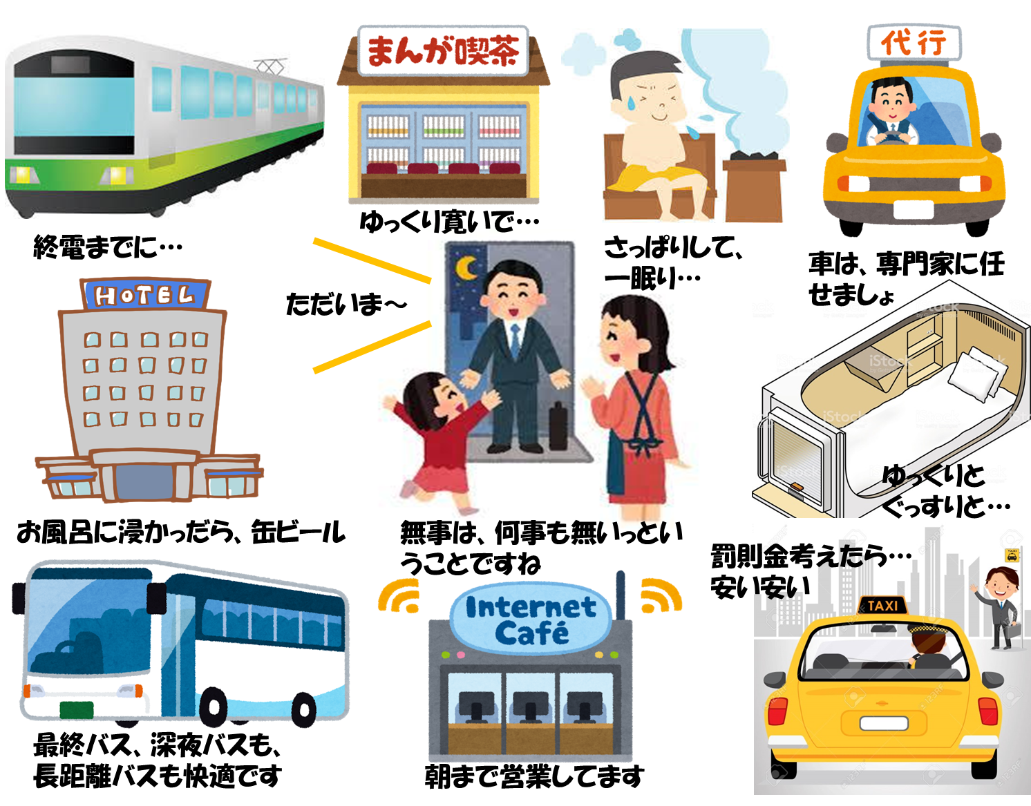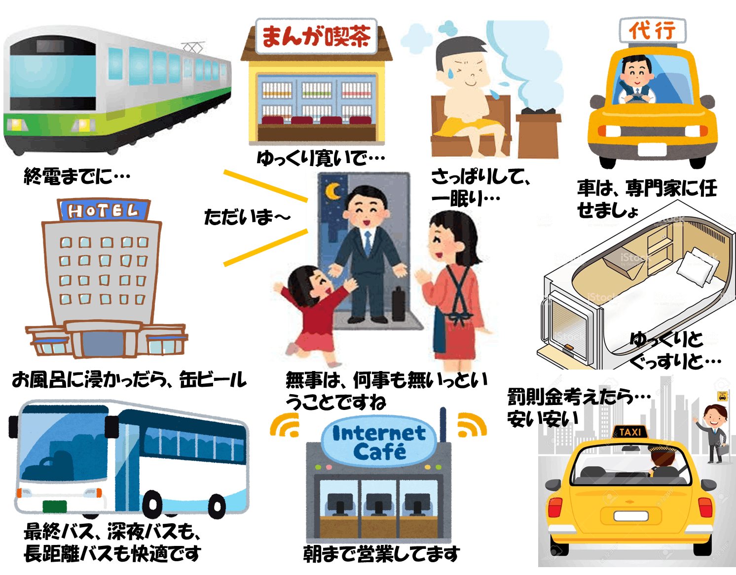 もう一度、お酒が決して、悪いわけではありません。楽しく飲んでいただき、運転代行やタクシー、公共交通機関の利用、また、サウナ・簡易宿舎(カプセルホテル)・ホテル等などに宿泊していただきたいのです。飲酒運転を行わない方法は、日本には、たくさんの選択肢があるのですから。