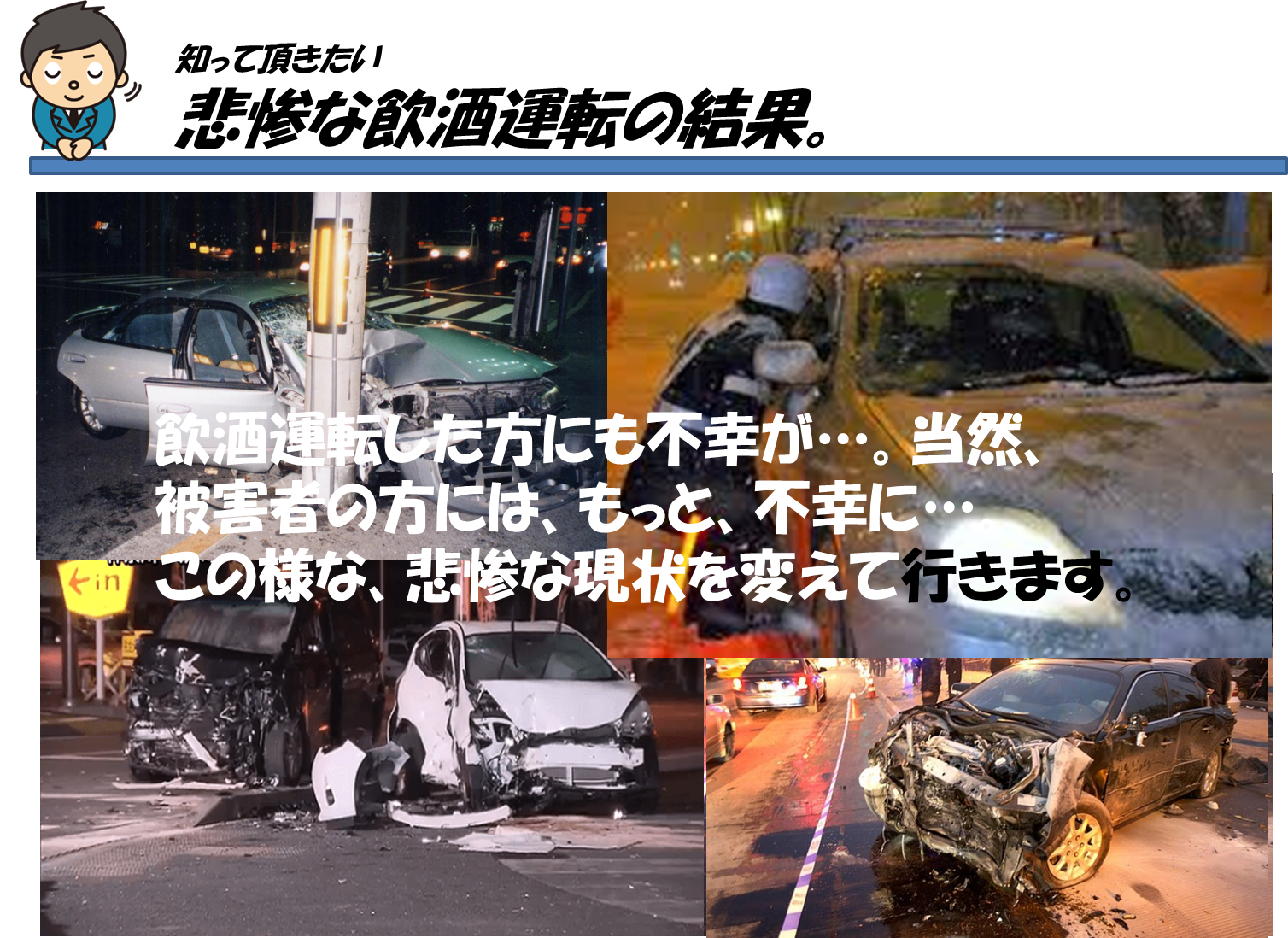 やはり、「お酒を飲んで、ちょっとでも運転したら、大変な事になってしまう!!」。貯金も下ろして、車も売らなきゃ...でも、足りるかなぁ?。突然、不幸がやってきます。まぁ、大丈夫と運転してしまう思いに、「飲酒運転はまずい」と、思っていただけるよう、法改正も必要だと、みなさまのお気持ちに同調し、活動してゆきます。このプロジェクトを急がなくては、なりません。誰もが、悲しむことのなく、楽しいお酒になるように変えてゆきます。