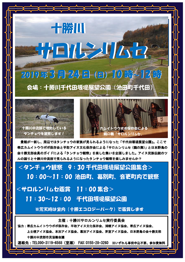 毎年高校生とタンチョウ給餌場を設置しタンチョウとのふれあい(遠くからの)をしてきました。昨年はこの千代田堰堤展望公園にも11月に給餌場を設置しましたが、12月には早くもタンチョウの家族が見られるよになりました。タンチョウが舞う千代田堰堤展望公園において、帯広カムイトウウポポ保存会による「サロルンリムセ(ツルの踊り)」と野鳥の会のガイドによる「タンチョウ観察」をぜひ多くの方々に楽んでもらいたいと思います。