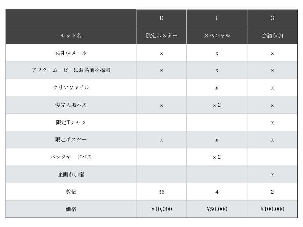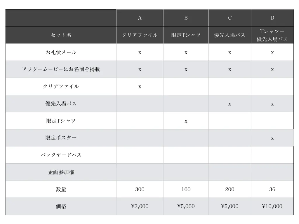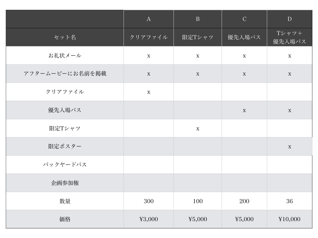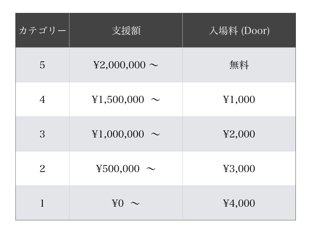 チケット価格は支援金額により変動します。下記の表をご確認ください。