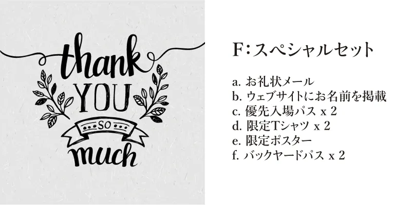 災害などのやむを得ない事情によりイベントが中止になった場合も、リターンの特典品は発送いたします。但し、優先入場パス等の当日提供となるリターンは一部無効となるものがあります。その際も、支援額の返金は行いませんので予めご了承下さい。