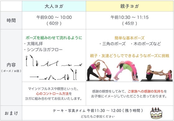 → 大人の部 ( 午前9時〜10時 )と、親子ヨガ ( 午前10時30分〜 11時15分 )は内容が違います。( 上の表をご参照ください )