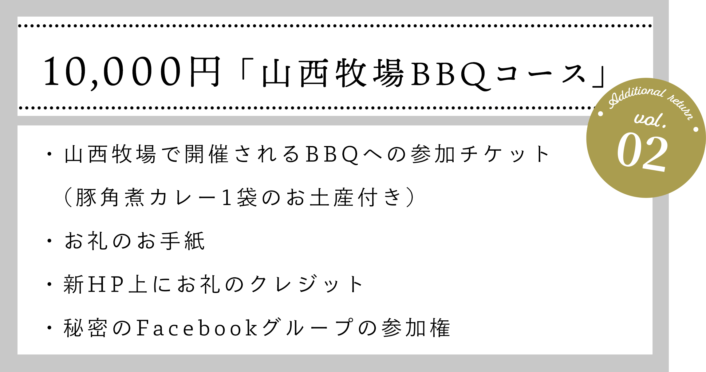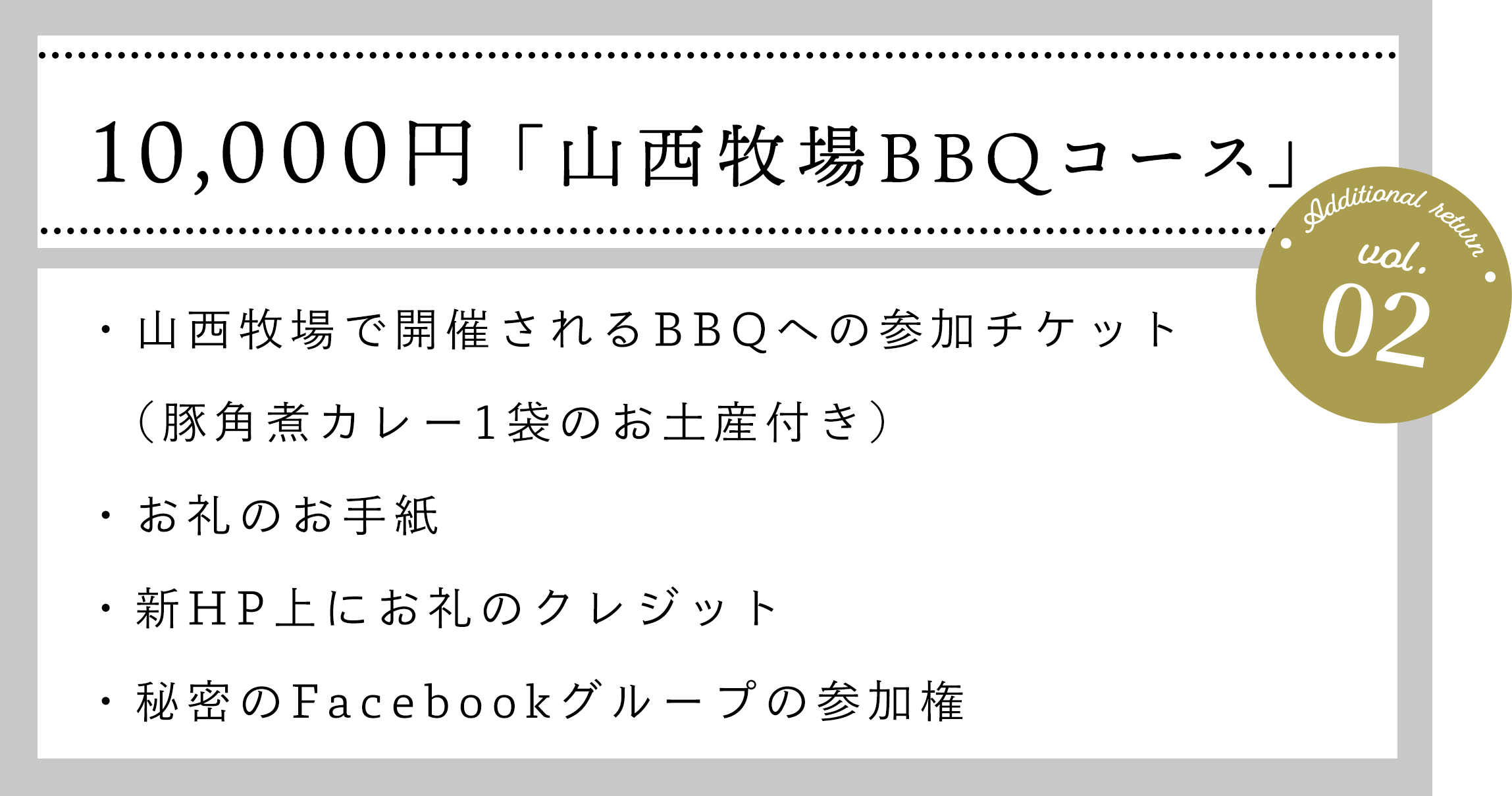 2020/02/29 11:30【明日3/1、サイトがリリースされます】ご無沙汰しております、山西牧場の倉持です。約、1年ほど前に実施させたいただきましたクラウドファンディングにて、沢山のご支援を賜りましてありがとうございました。このプロジェクトの本丸でもある山西牧場、そして農場直送ブランド「三右衛門」のブランドページ及びオンラインストアが明日、3/1についに公開となります。今までリターンの発送や、新製品の製作販売、イベントの実施などを経て様々な出会いや学びを頂きました。私の伝える活動から「こんなブランドを」という思いを詰め込んだサイトになったと考えています。是非ご覧いただけたら幸いです。山西牧場、及び「豚野郎」としての新たなスタートを皆様に見ていただけたら嬉しいばかりです。今後ともご愛顧いただけますよう、止まることなく挑戦を重ねてまいりますので、引き続きどうぞよろしくお願い申し上げます。NEW WEB SITE→https://yamanishifarm.com又、Thanks pageには支援頂きました皆様のお名前を掲載させていただいております。もし削除(非掲載)や名前の変更希望がございましたらこのメールの返信にて承ります。株式会社 山西牧場代表取締役 倉持信宏 もっと見る【クレジット掲載について※個人情報のため要確認】