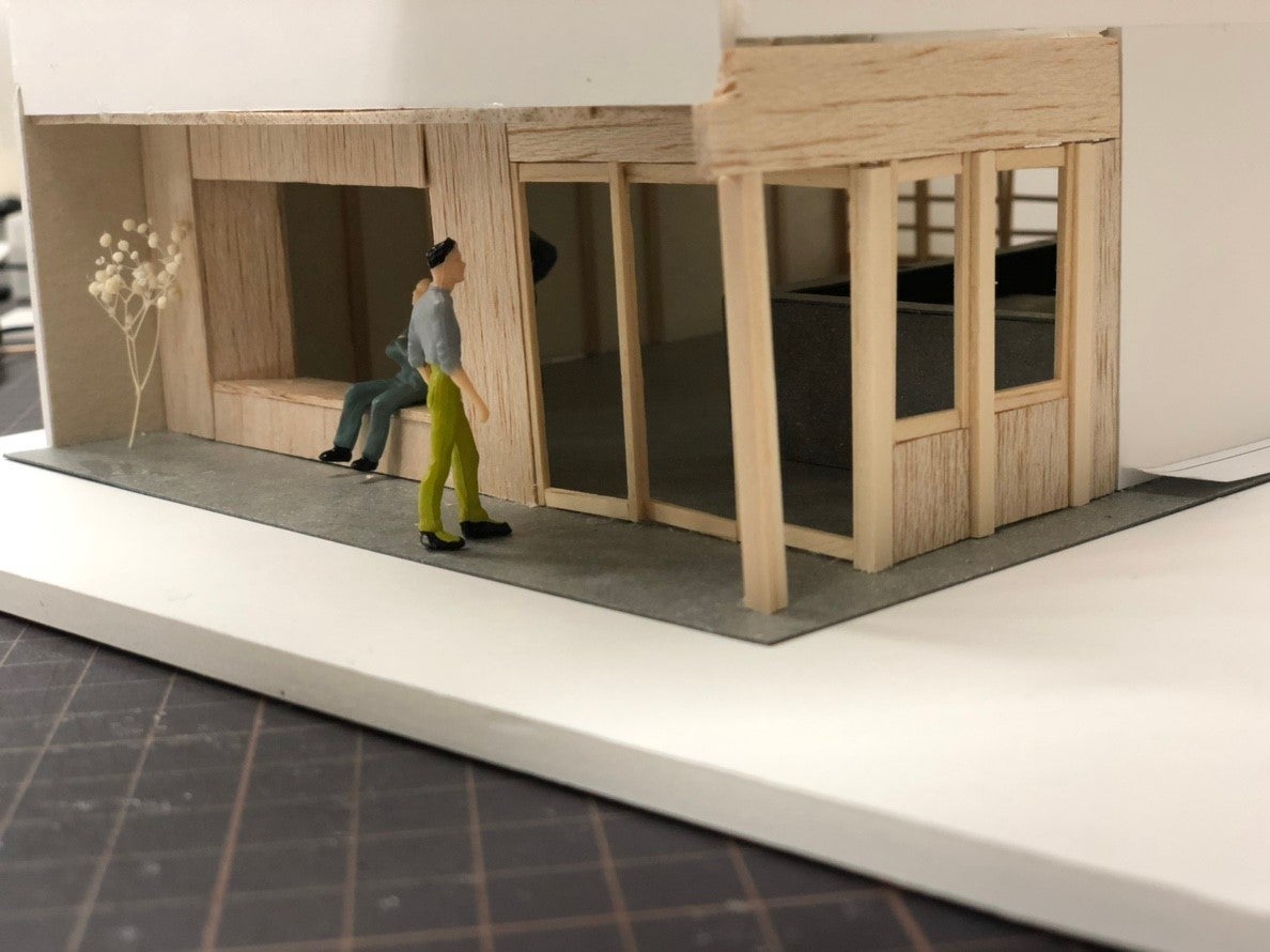 日毎、時間毎に変化する店舗内空間をさまざまな角度、奥行きから新たな表情を商店街に映し出すとともに、ベンチ空間を併設することで内と外を対応させるようにしました。このような窓のデザインが新町商店街の新たなアイコンとなることを期待しています。