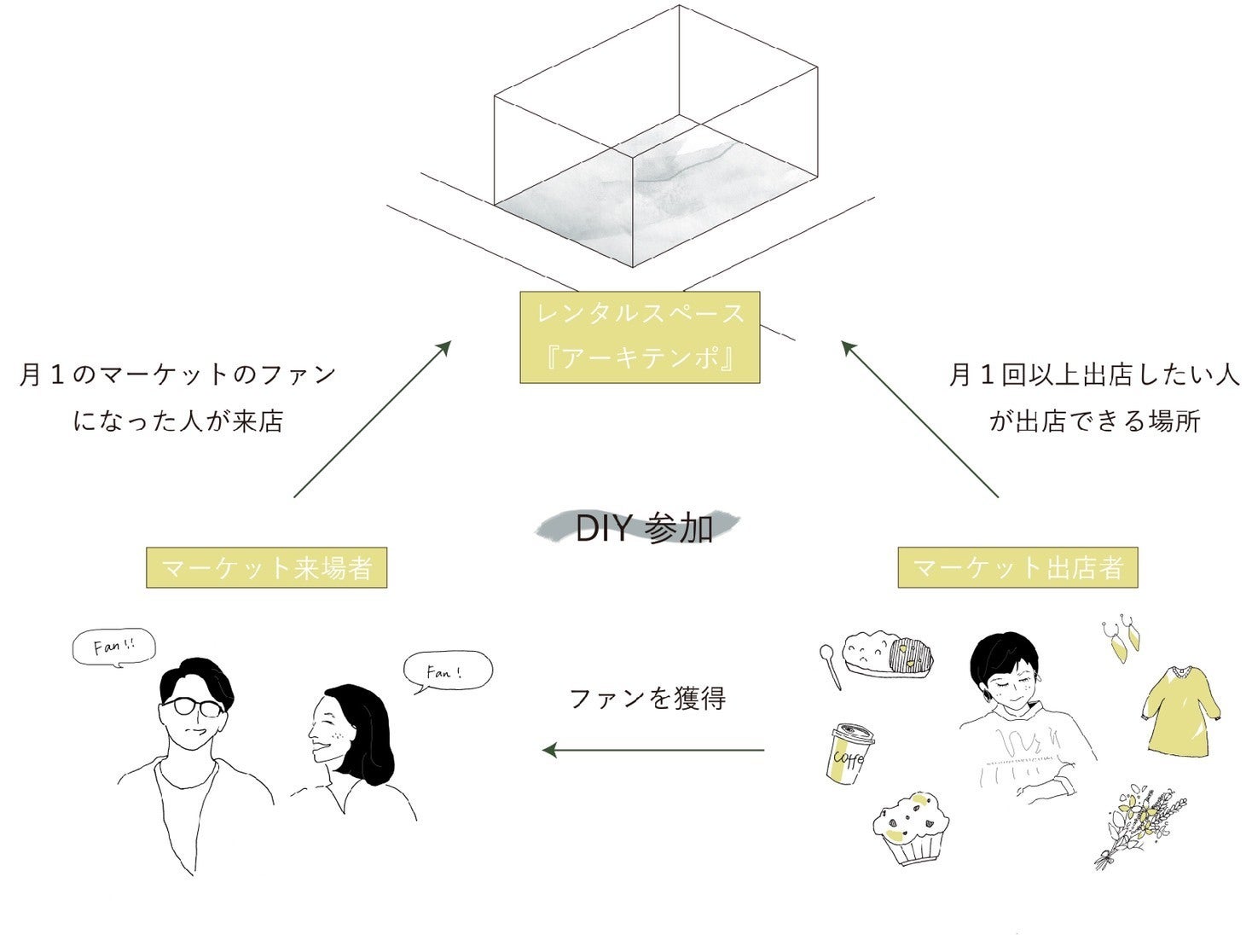 そこで、月に1回福知山ワンダーマーケットに参加してくれているお店の次のステップとして、1日単位での貸し出しを行う厨房付きレンタルショップを運営します。お客様もマーケットで好きになったお店が物量を増やして本格的なお店のように出店することを楽しむことができ、商店街に賑わいが生まれるのではないかと思っています。