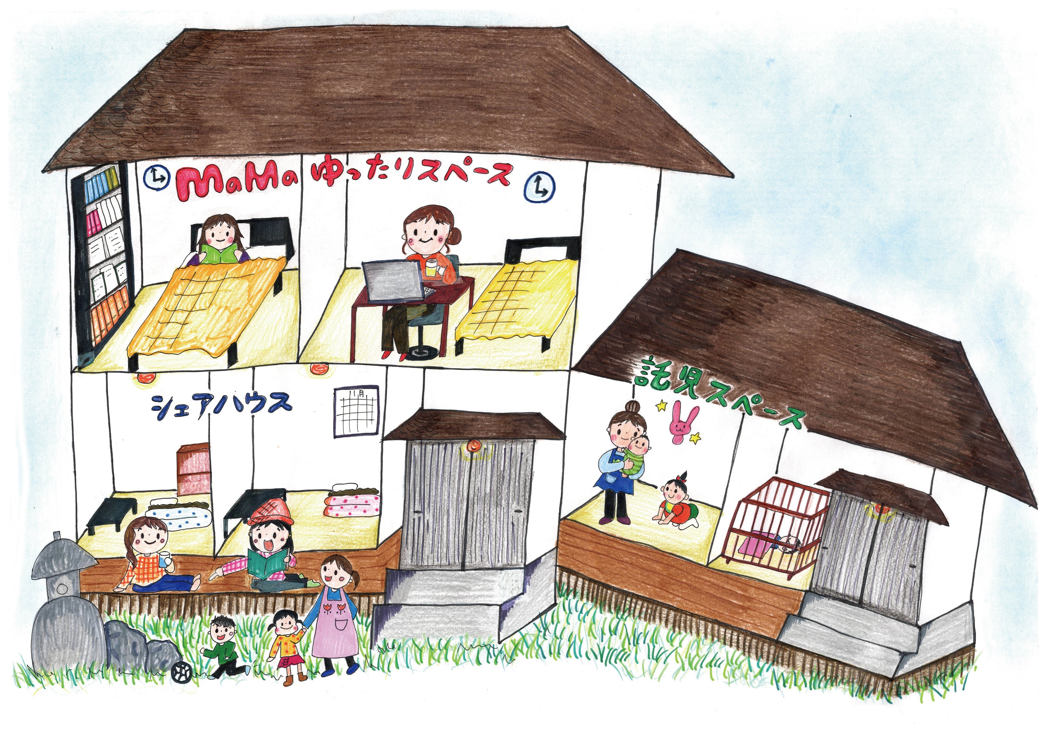 0~2歳を中心に、こどもたちを預かる場所を作ります。ひとりひとりをきちんとみることができるように、6人程度の少人数で一時預かりのみを行う施設とします。保育士、看護師、子育て支援員、そして地域のママたちと一緒に、こどもが安心安全に過ごせる空間をつくります。