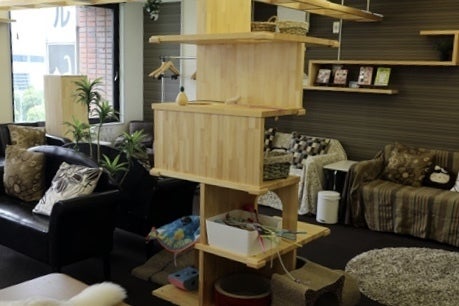 ケージ、ソファ、椅子、レジ、下駄箱、ロッカー、机、キャットタワー、猫のおもちゃ、トイレ、猫砂、