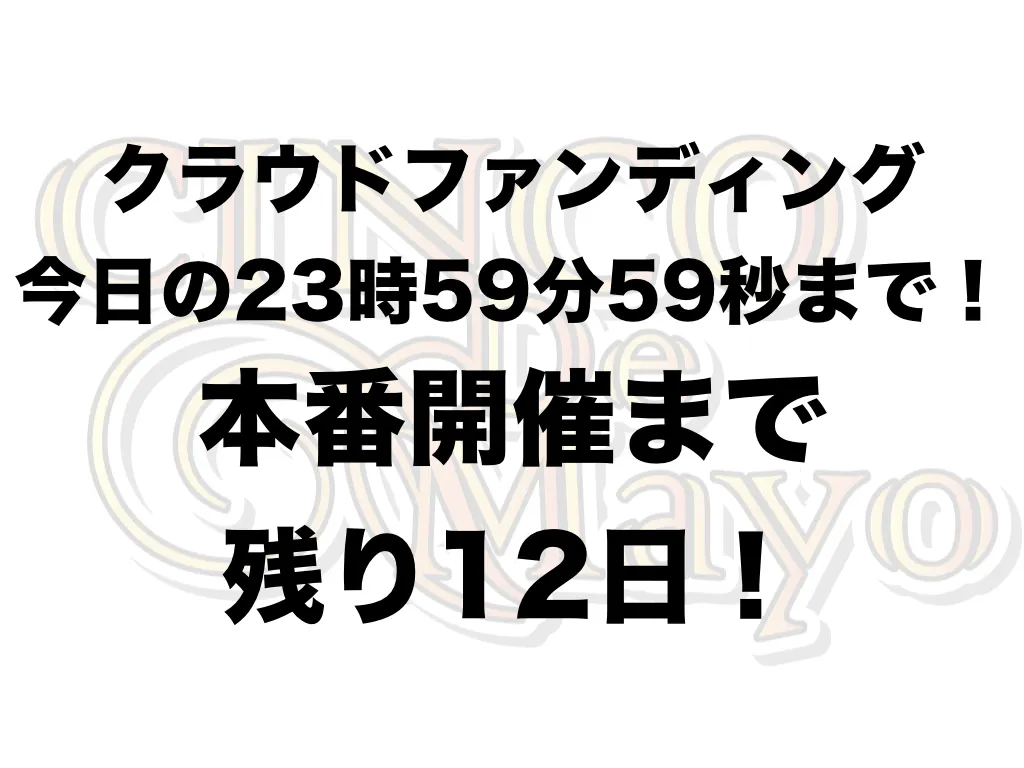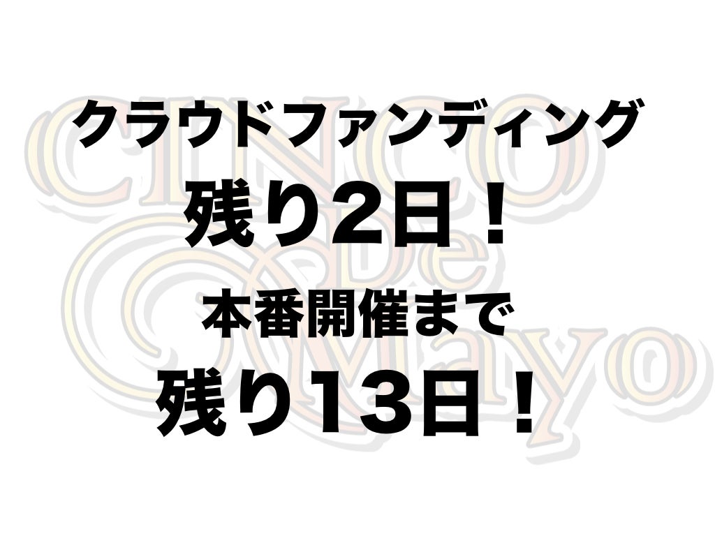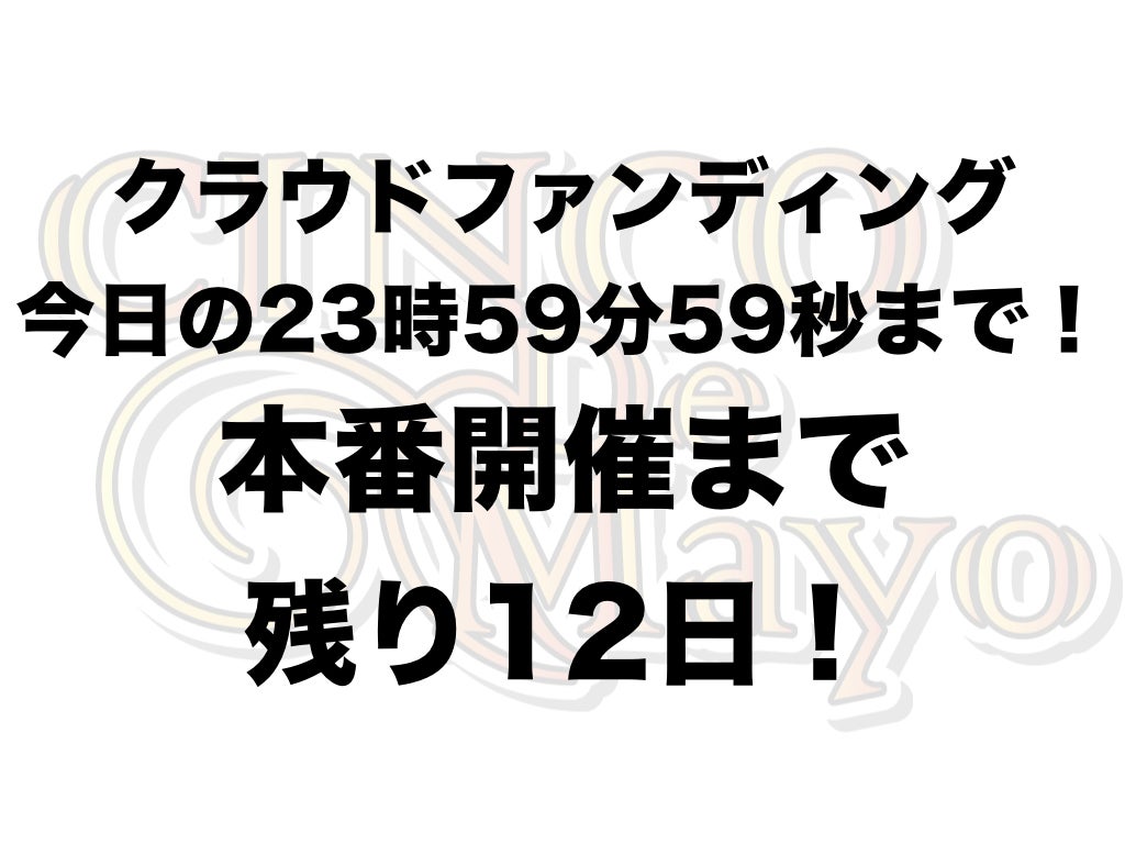 2019/04/28 18:33シンコ・デ・マヨを救うためのクラウドファンディングは残り2日!29日23時59分59秒で終了となります。駆け込みのご支援、お待ちしております!本番開催までも残り13日です。皆さんで盛り上げていきましょう!最新情報などはこちらでも発信しています!ーーーーーーーーーーーーーーーーシンコ・デ・マヨのHPはこちら!HP:http://www.cincodemayo.jp/シンコ・デ・マヨのFacebookページはこちら!FacebookPage:https://www.facebook.com/cincodemayojapan/シンコ・デ・マヨのFacebookページはこちら!FacebookEventPage:https://www.facebook.com/events/510369046159517/クラウドファンディングでの特別支援はこちら!CAMPFIRE:https://camp-fire.jp/projects/view/134027ーーーーーーーーーーーーーーーー もっと見る
