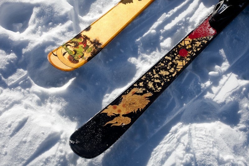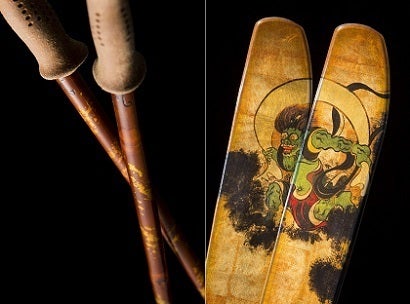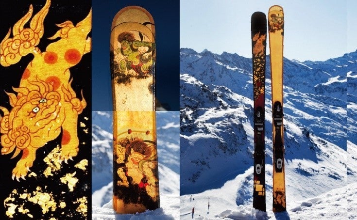 漆、蒔絵、螺鈿、金箔などの伝統工芸を用いたスキー板。